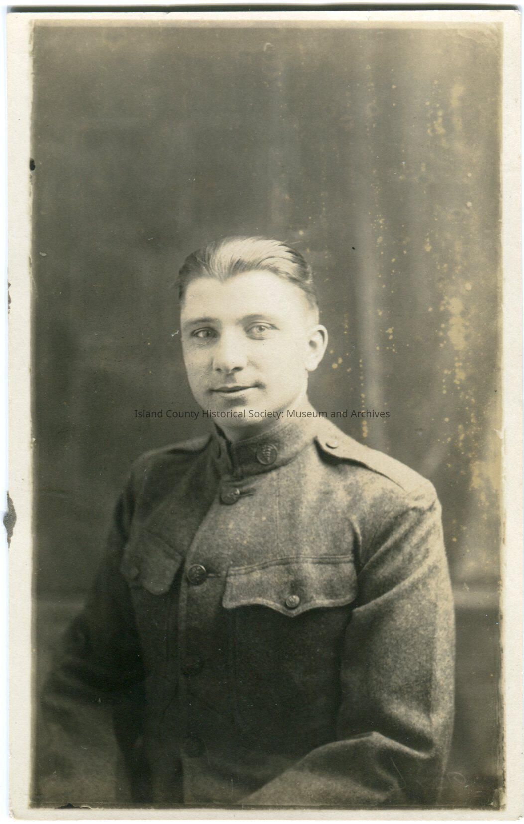 Postcard of a man in World War I uniform. He has a widow's peak. Written on the back: Ray Morris 40