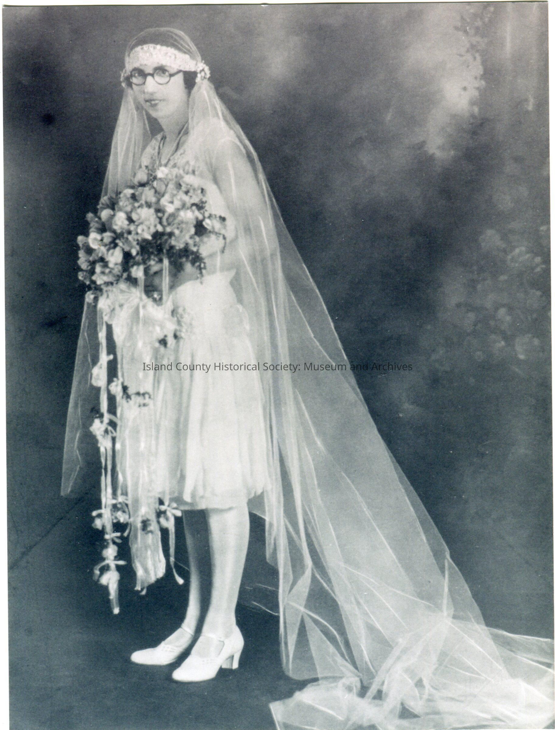 Photo of a young woman in her bridal gown. It is knee-length, flapper style. She has a very long train from her headdress. She is carrying a large bouquet of flowers ribbons dangling down. She is wearking stockings and shoes with a strap at the top of the arch. She is wearing glasses.