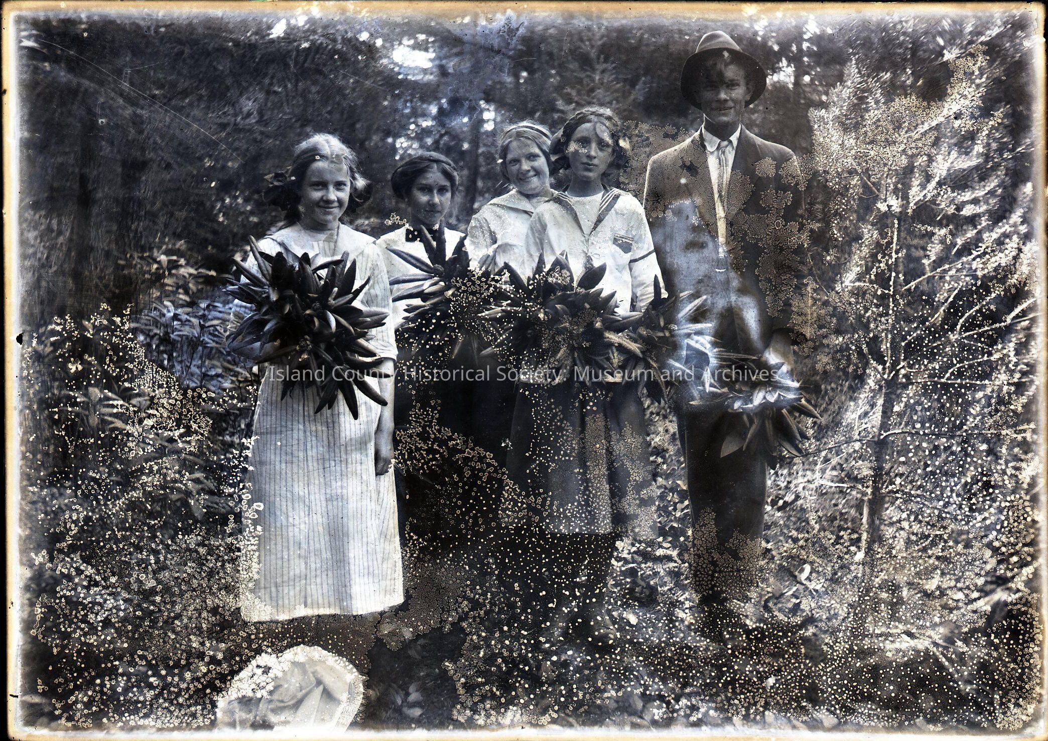 Group of four older girls and one young man in a glade. The girls are holding some of the plants.