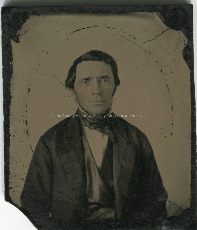 Glass plate negative of a man in a suit in the mid-1800s. He has a satin tie, and a beard along the edge of his jawline. Per a sticky note: Glass ambrotype (Not Morris, Timothy H.) died at battle of Shiloh, Tenn., April 6, 1862. Grandfather - Bertha Morris Cummins Possibly Samuel Putney - Timothy's father-in-law
