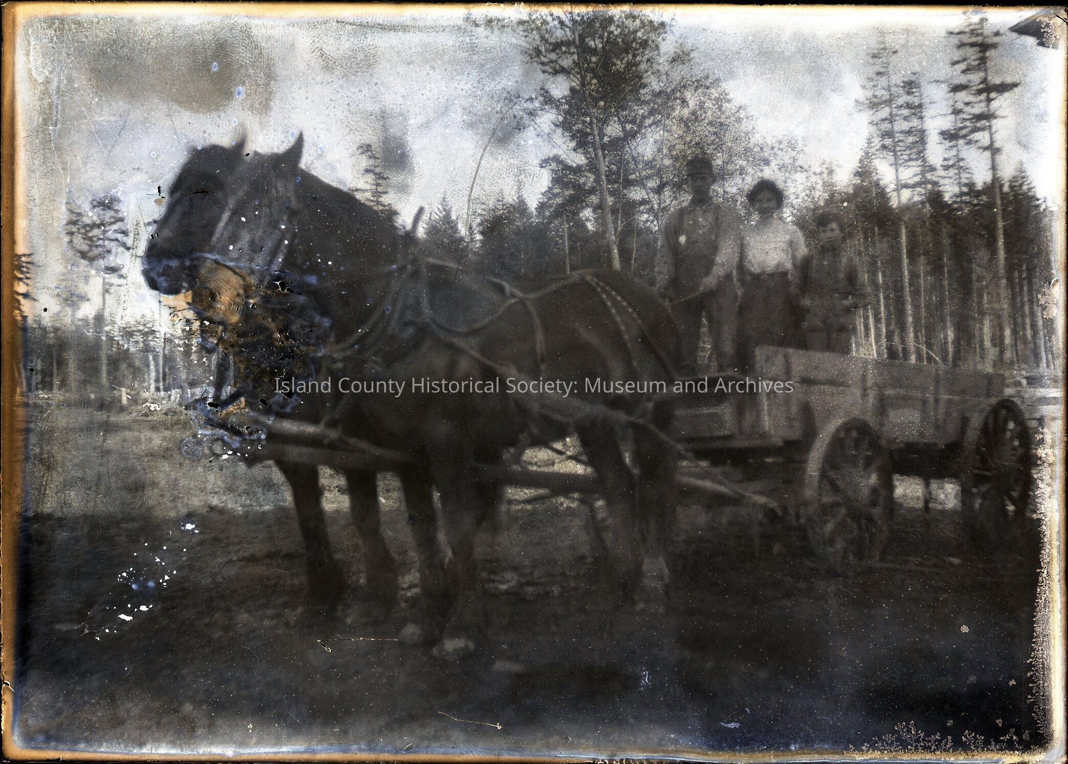 Two boys standing either side of a young woman or girl - all are standing in a wagon. The older boy is holding the reins to two horses pulling the wagon. They are in a cleared area.Made/Created