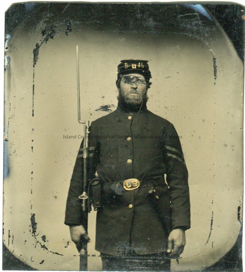 Tintype of a man/soldier in a U.S. Army uniform during the Civil War. His hat has BU 16 on it. He is carrying a rifle and bayonet. He has a beard. Per a sticky note: Morris, Timothy H. Died at battle of Shiloh, Tenn., April 6, 1862. Grandfather Bertha Morris Cummins