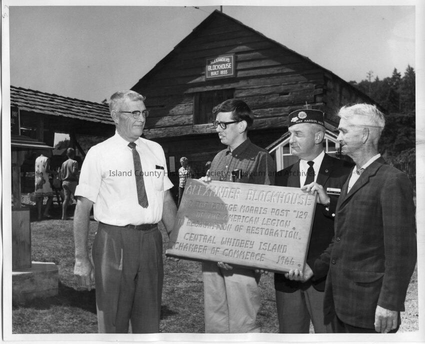 Article on back of photo reads: "Ralph Ward, mayor of Coupeville, Whidbey Island, left dedicated the historic Alexander Blockhouse near Front Street in yesterday. The structure was recently purchased by the Coupeville Chamber of Commerce for $5000 as a historic site. From left were Ward; Donald Sorrenson, president of the Coupeville Lions Club; William Coyle, commander of the George Morris Post No. 129, American Legion, and Herman Wanamaker, Coupeville pioneer. Ward comended them for their parts in restoration of the blockhouse. The mayor presented a plaque to the American Legion post in honor of the Legion's initial effort in 1933 to preserve the structure."