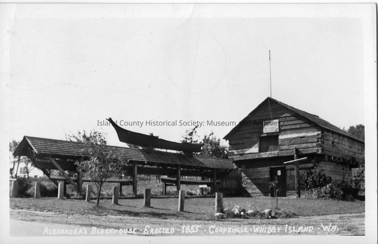 Black and white photo postcard of the blockhouse, erected 1855. Post stamp is dated 1942. Postcard also shows the canoe shelter.