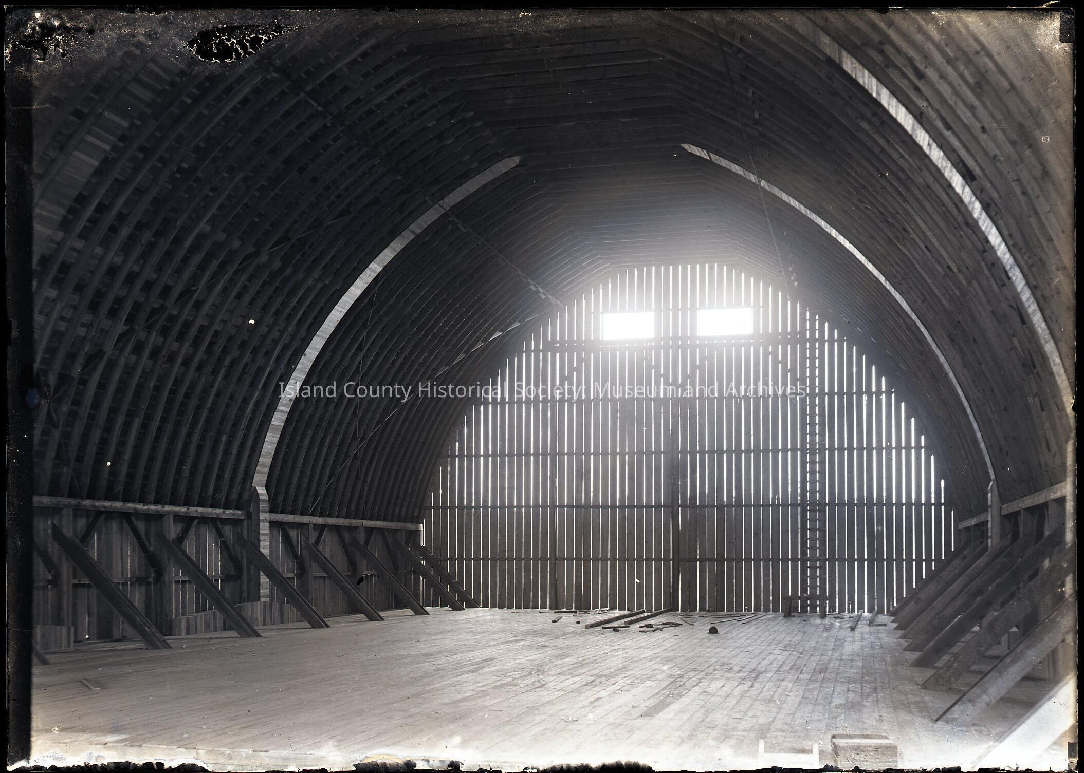 Roller/ Neil barn under construction. View from inside looking towards one of the ends - doors are closed. Two windows are open high on the doors. Built by Otto Van Dyk.Made/Created