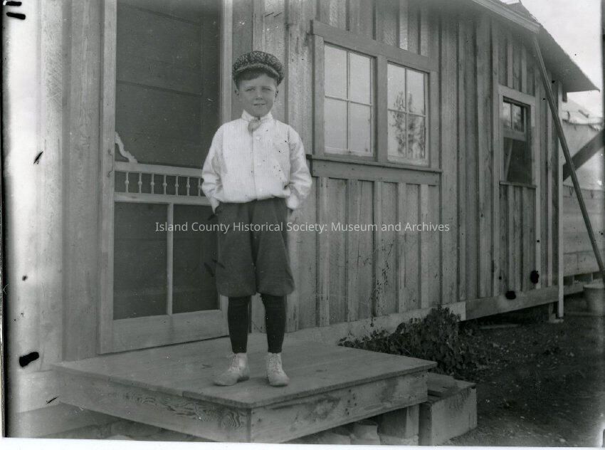 Historic photo from Coupeville Examiner Black and white photo of a young boy on the porch of a house. The boy is wearing knickers, a buttoon down shirt, and a cap.