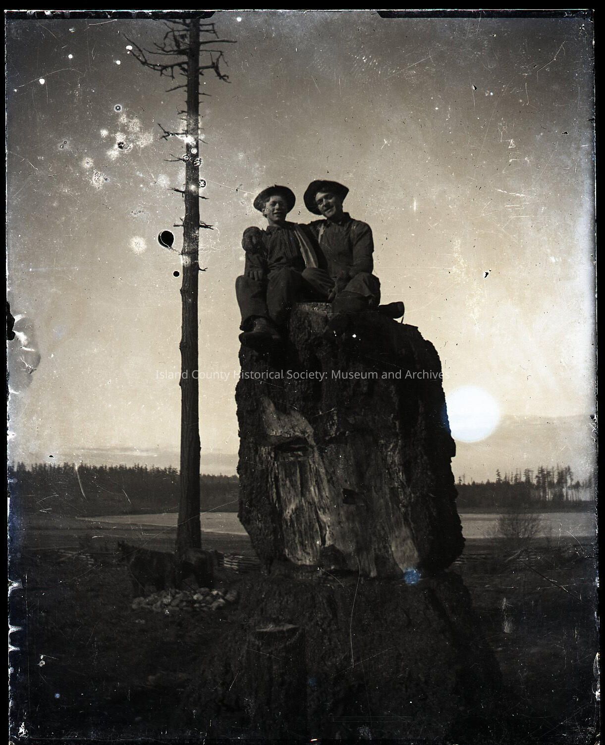 Two young men seated on top of a huge tree stump. Sun in the background. Lone bare tree. Coast or lake behind them.