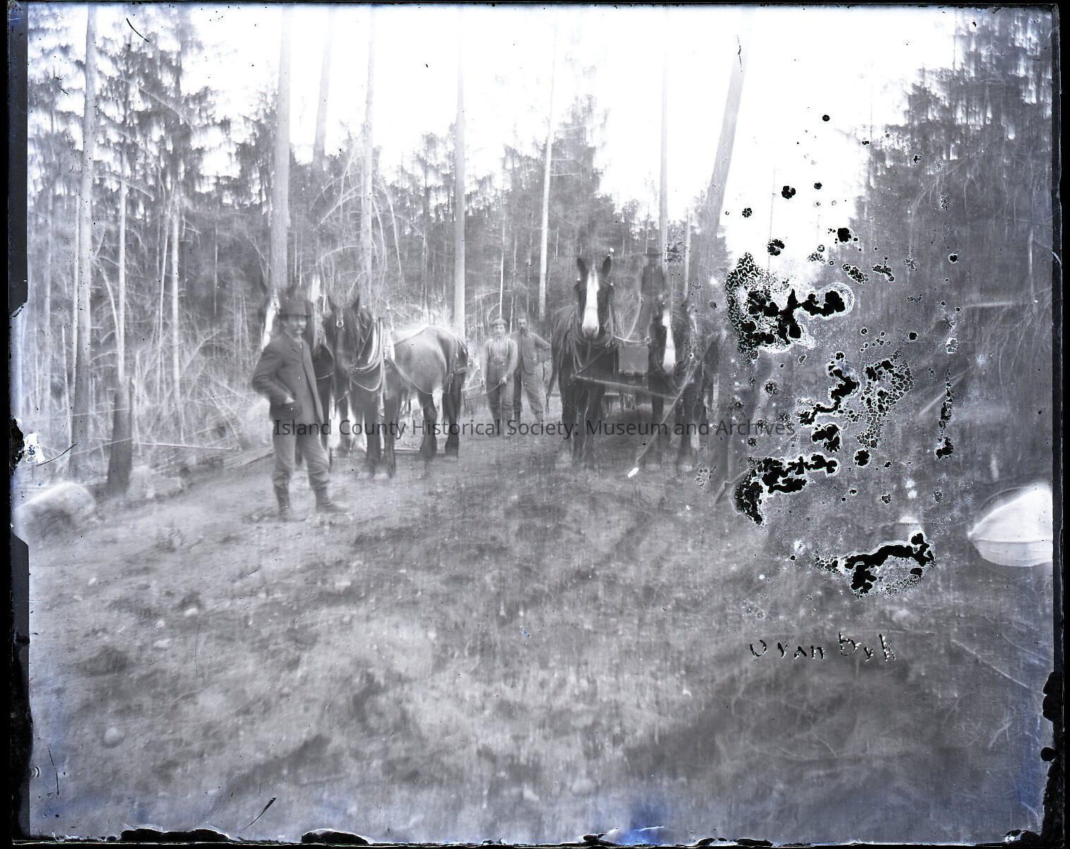 Group of men and two teams of horses, wagon standing on a dirt road. Probably logging. One of the horse teams likely belongs to John Van Dyk.Made/Created