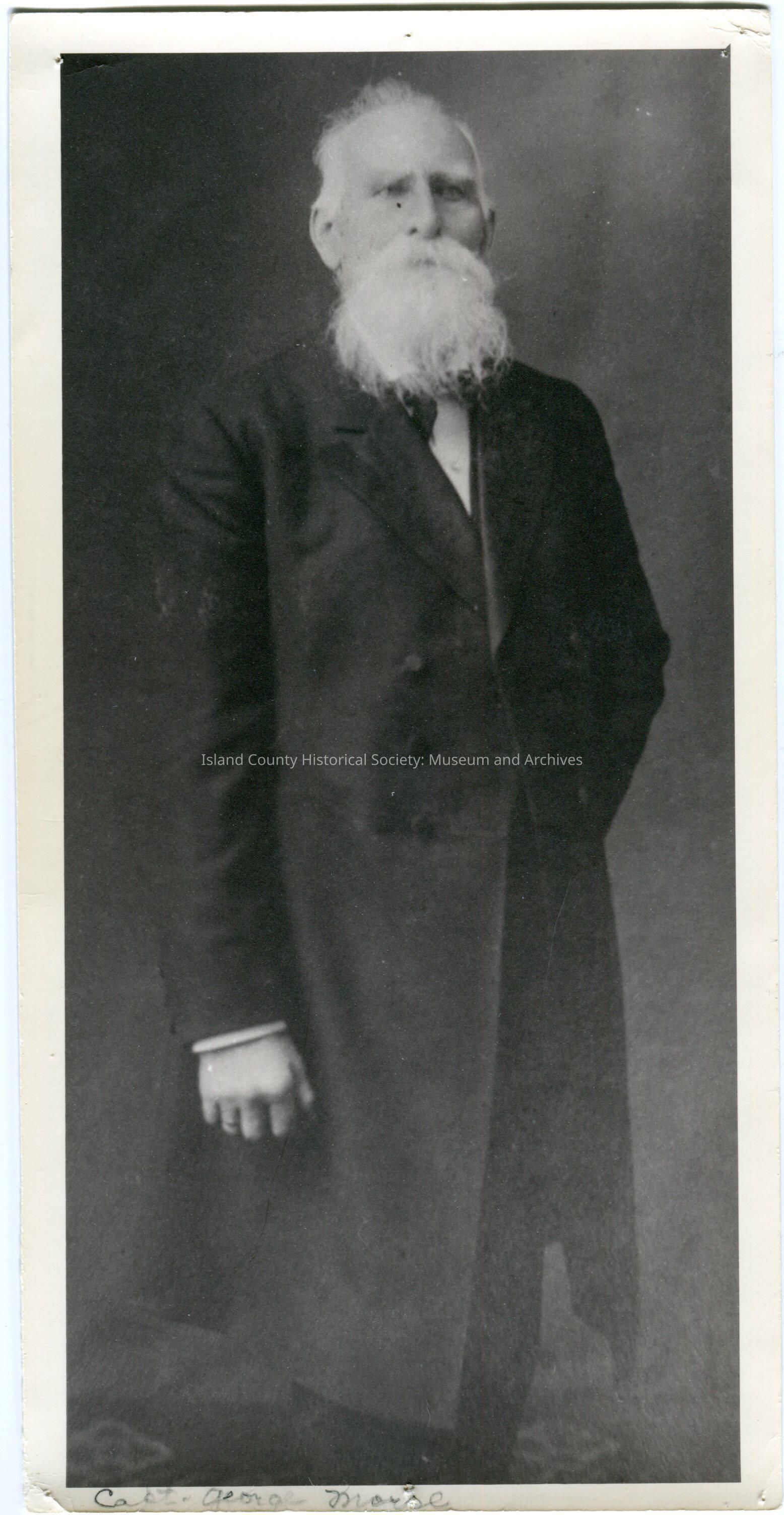 Photo of an old man with a wide beard and mustache. wearing a suit with a long coat, and standing looking to his left with his left hand behind his back. Written on the back: Capt. George W. Morse, First Representative to the Wash. State Legislature from Island Co. 1890. From picture loaned by Madeline Durst