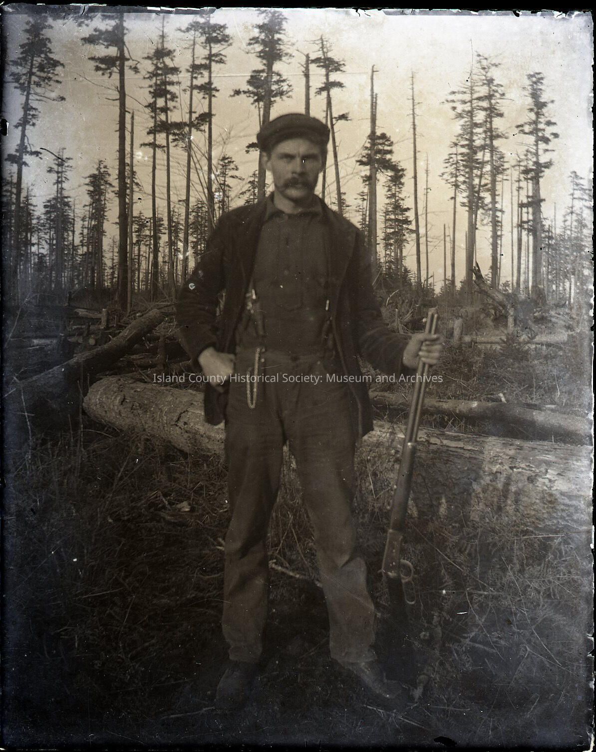 Young man holding a rifle in a cleared area of a woods. Probably logging.