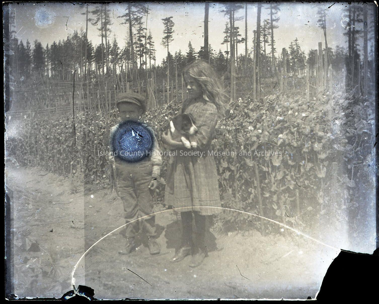 A boy and a girl, who is holding a puppy - standing in probably a farmed field. Dirt road. Trees.