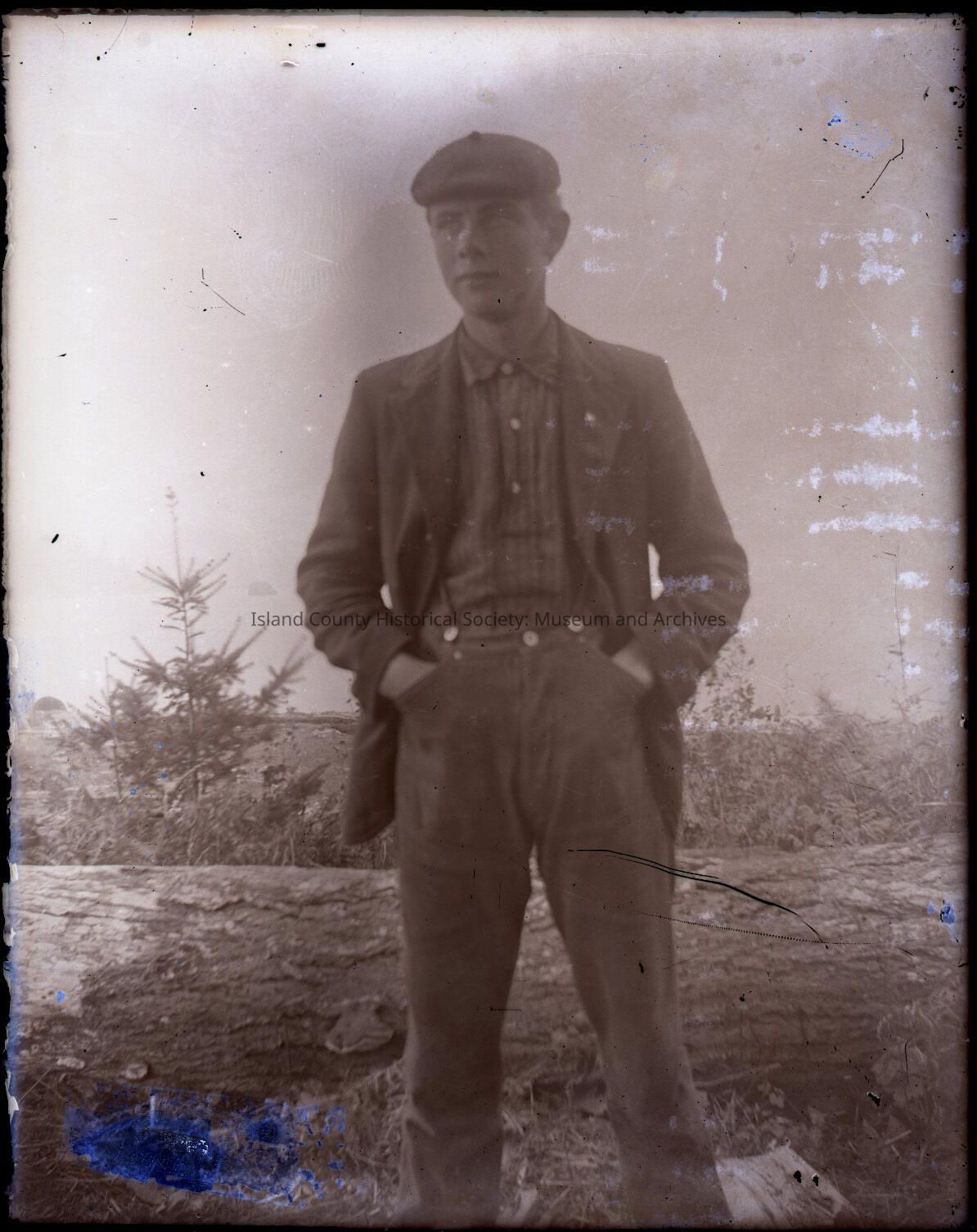 Man standing in a cleared area. Wearing jacket and flat cap.