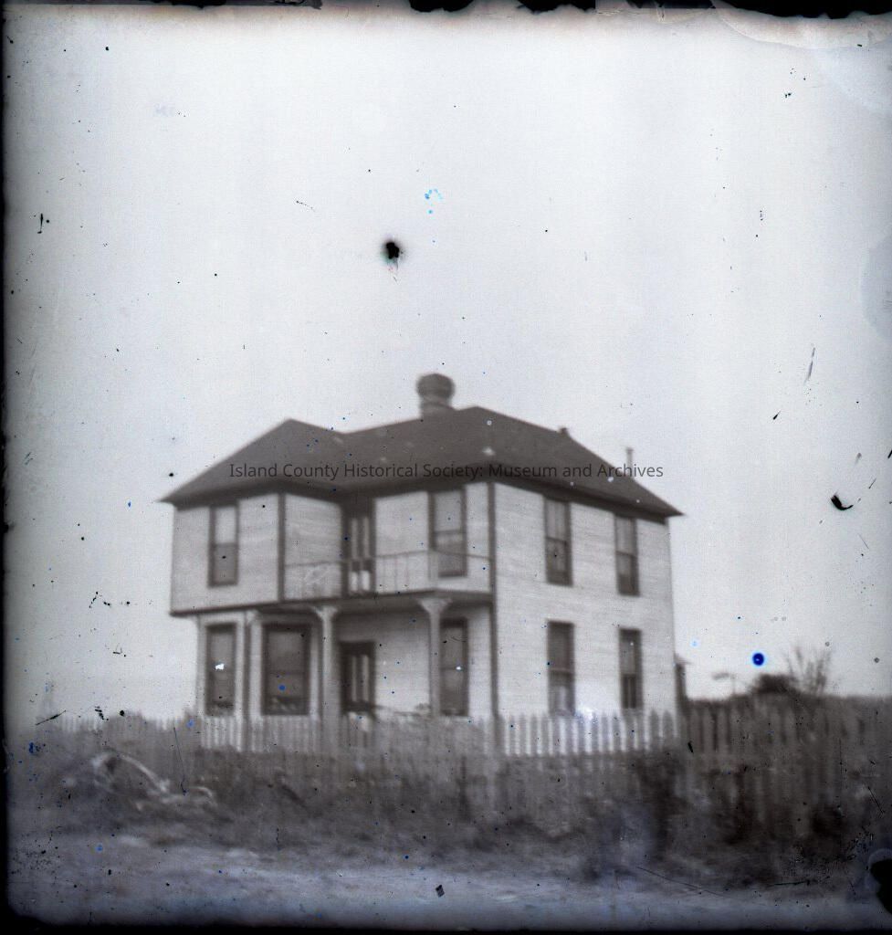 Two-story house, front porch, chimney. Fence. Dirt road.