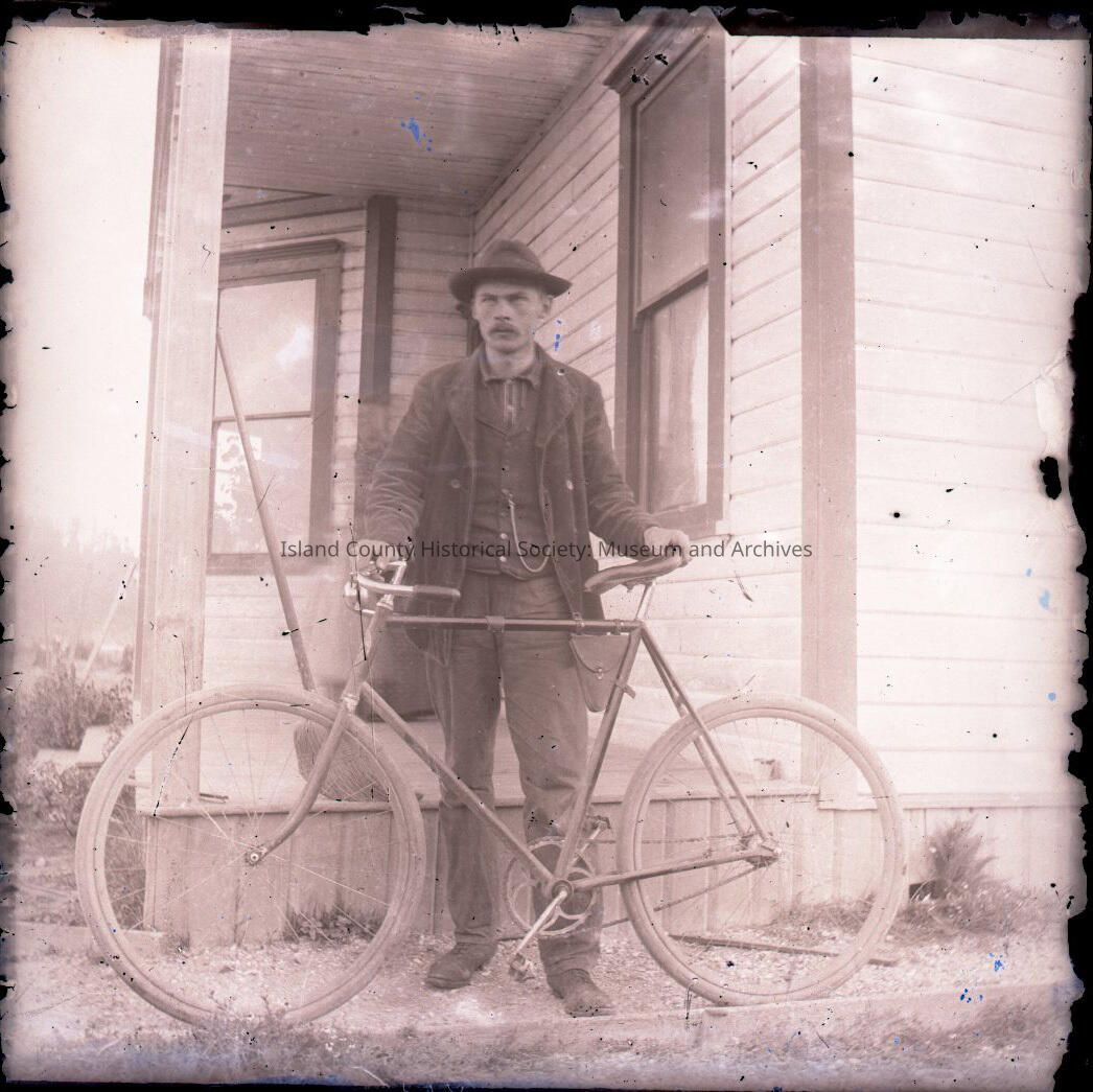 Man wearing jacket and hat standing beside the porch of a house, holding a bicycle by the seat and handlebars.