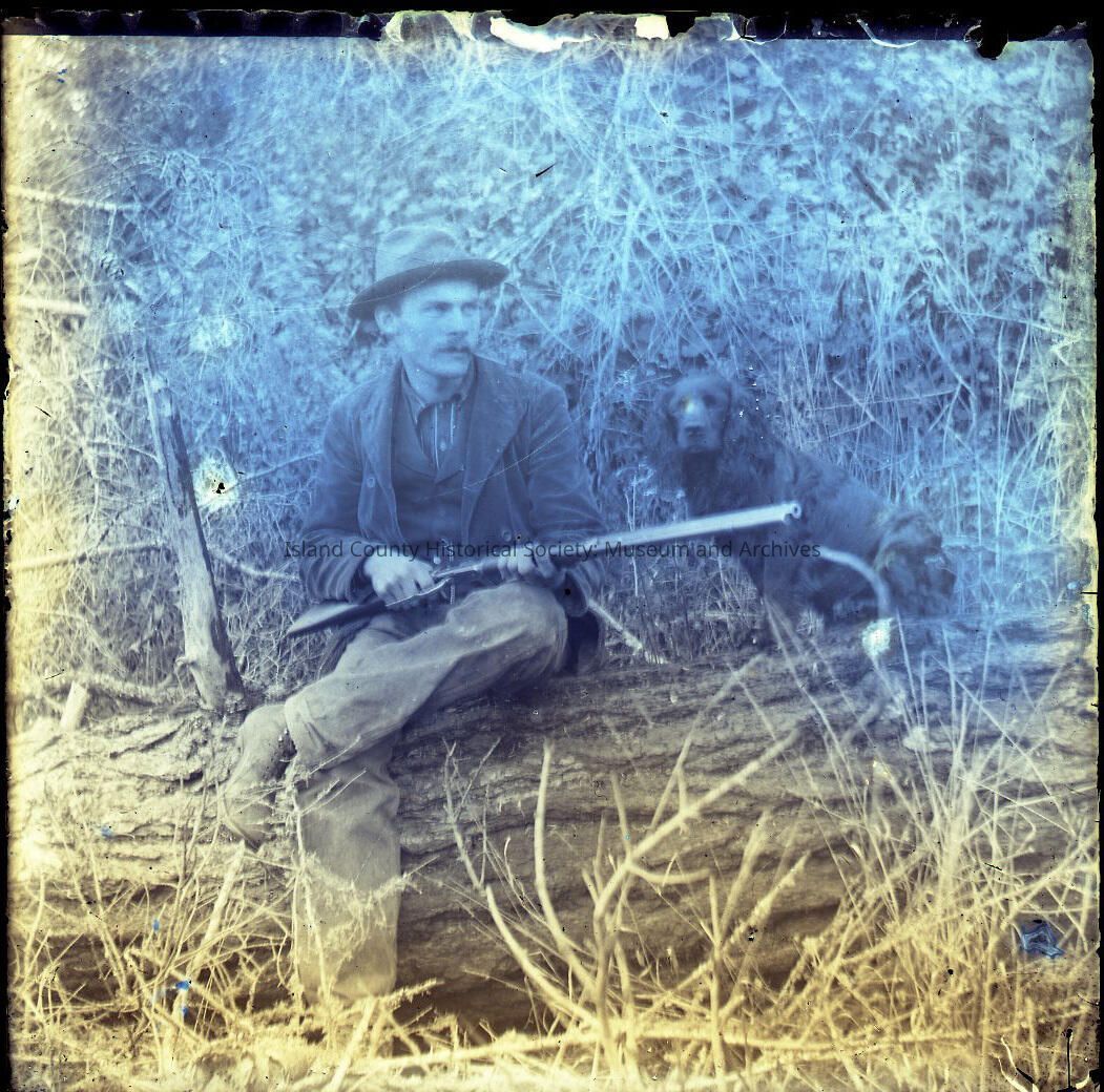 Man wearing jacket and hat seated on a large log holding a rifle, a dog beside him.