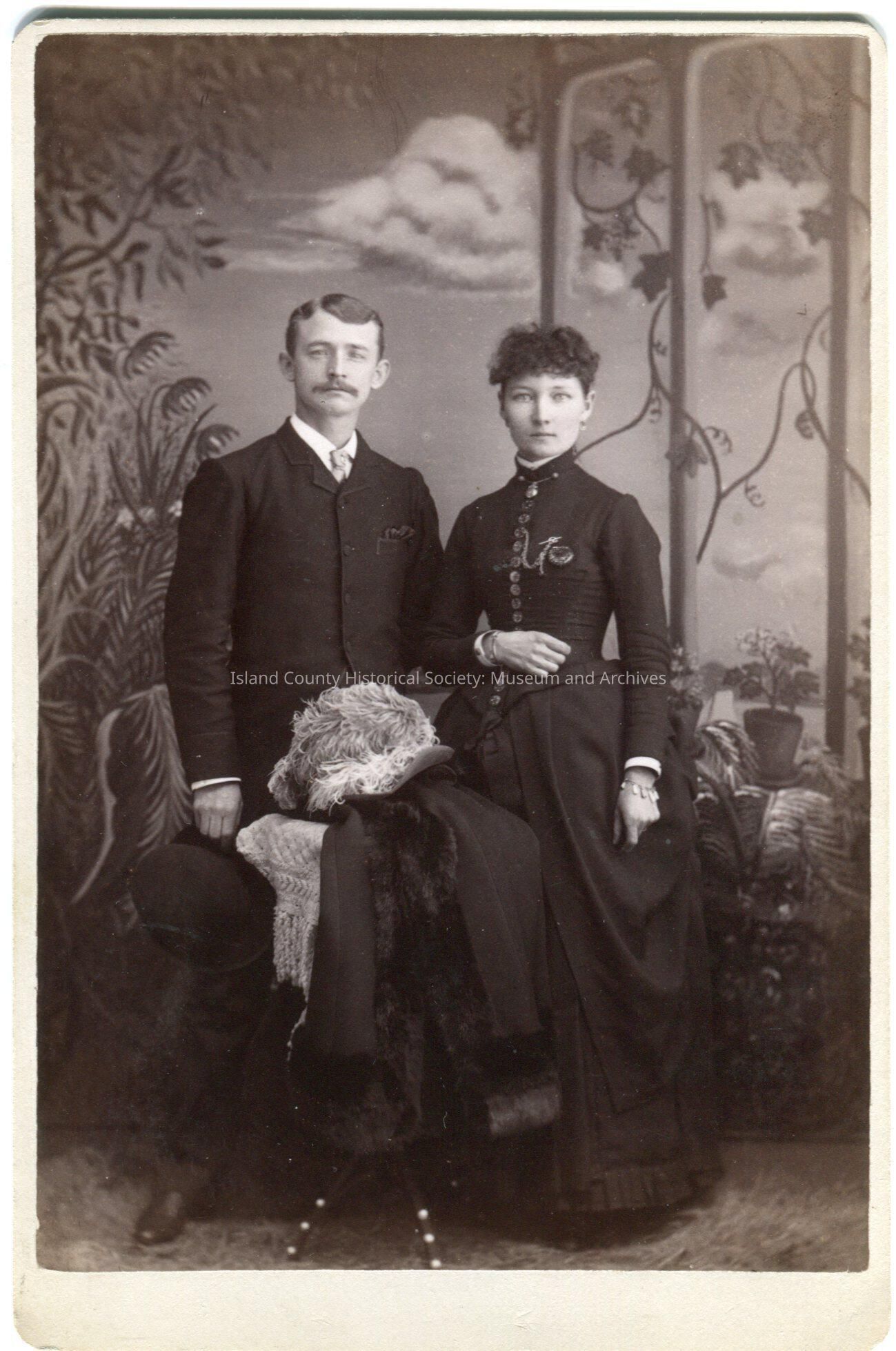 Photo of a woman and man standing in front of a backdrop with a trellis and behind a table with tablecloth and plumed hat and cape or coat. She is wearing a skirt and jacket with a watch fob and necklace and bracelet. The skirt has a ruffle at the hem. He is wearing a suit and tie.