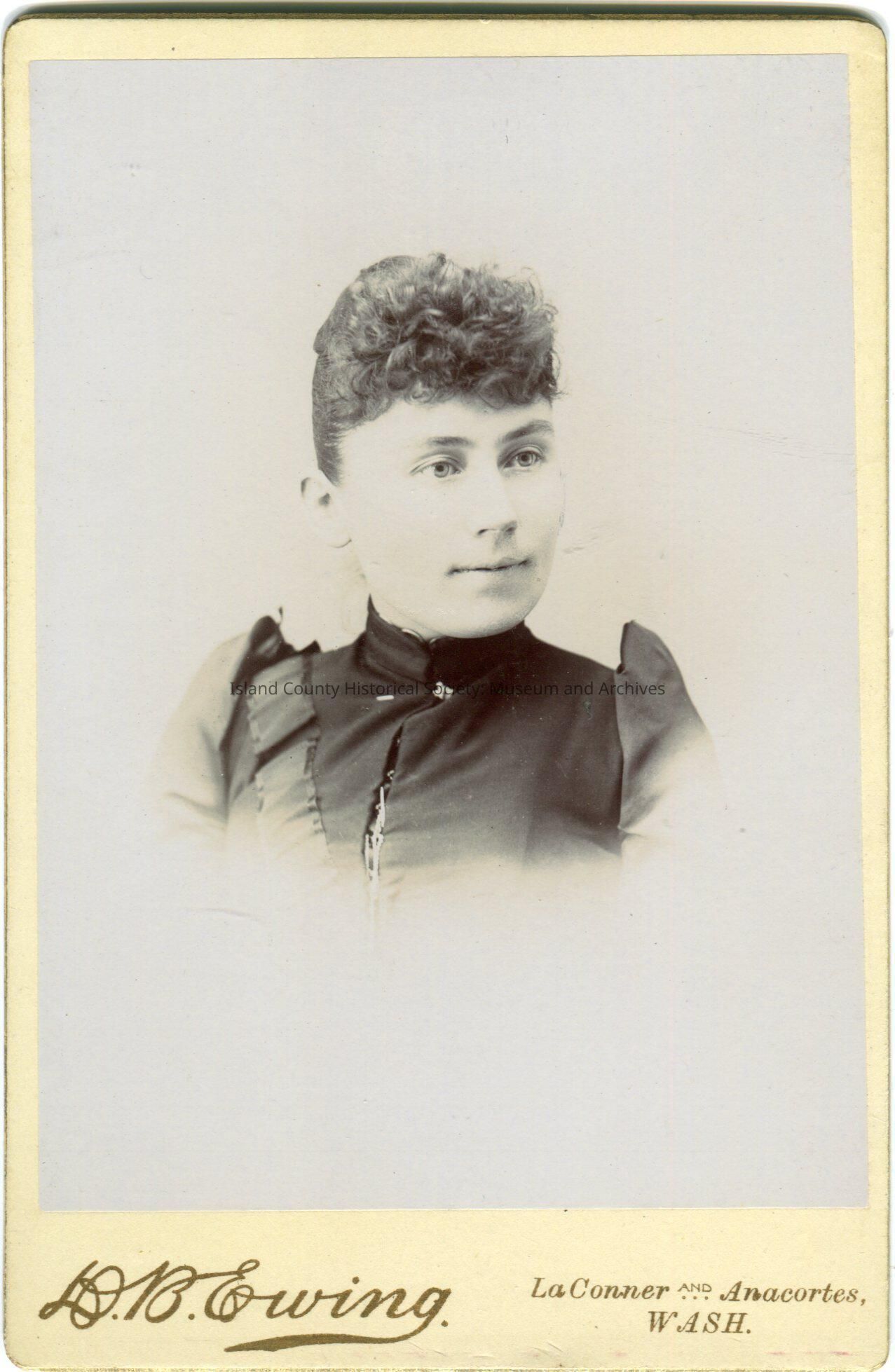 Photo of a woman looking towards her left. She is wearing a jacket with puffed sleeves and a pin at her collar. Her hair is curly in front and pulled up and back.