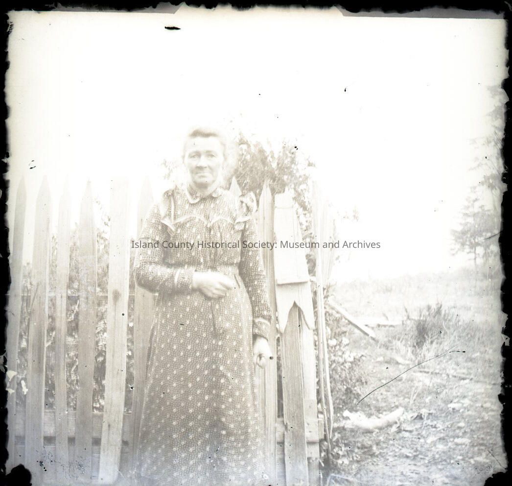 Middle-aged woman standing in a garden, picket fence behind her. She is wearing spectacles and a flowered dress with ruffles on her shoulders. Same woman as in 2016.163.052.Made/Created