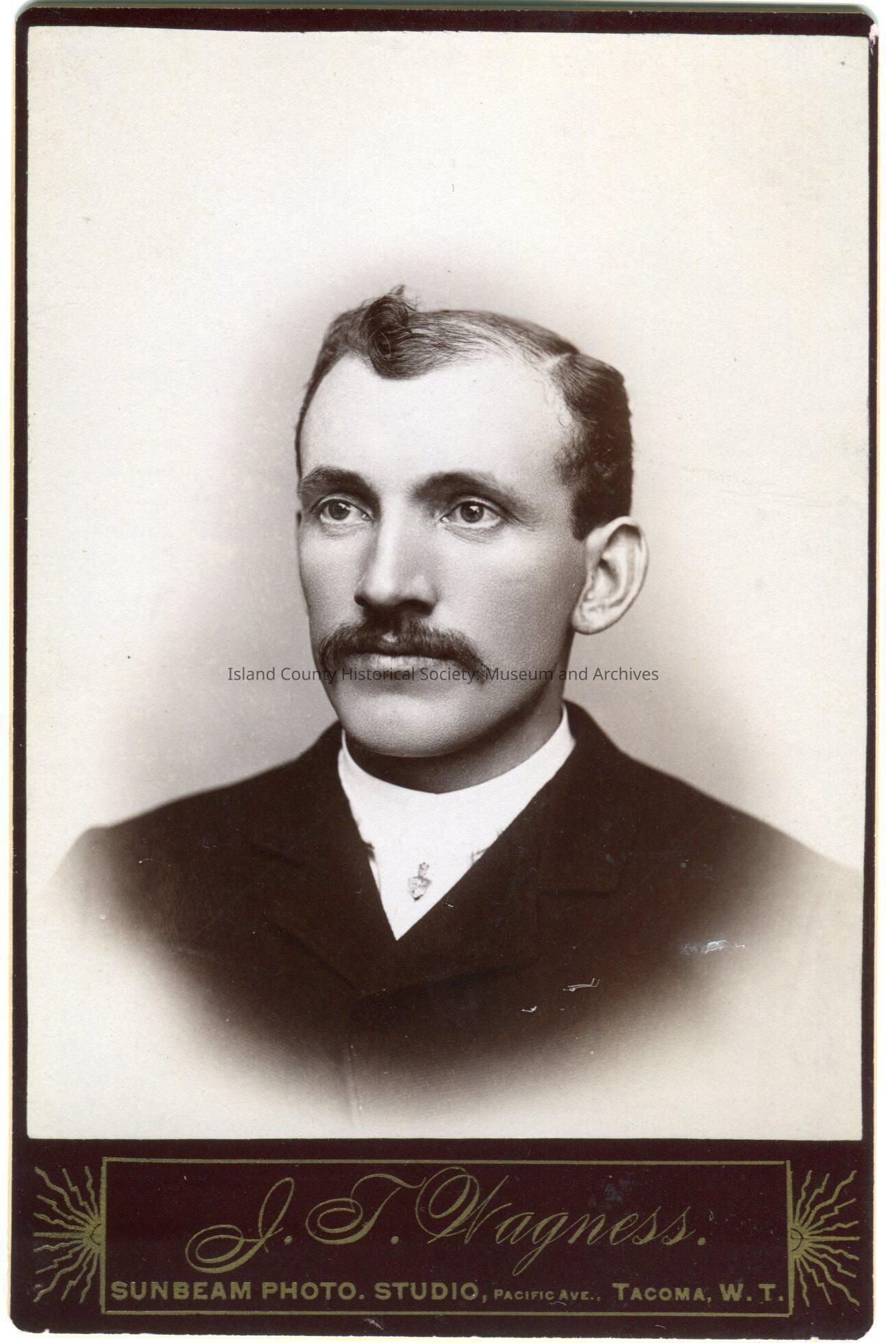 Photo of a man wearing a suit, with a tie with a pin at the neck, and small standup collar. He has a thin long mustache.