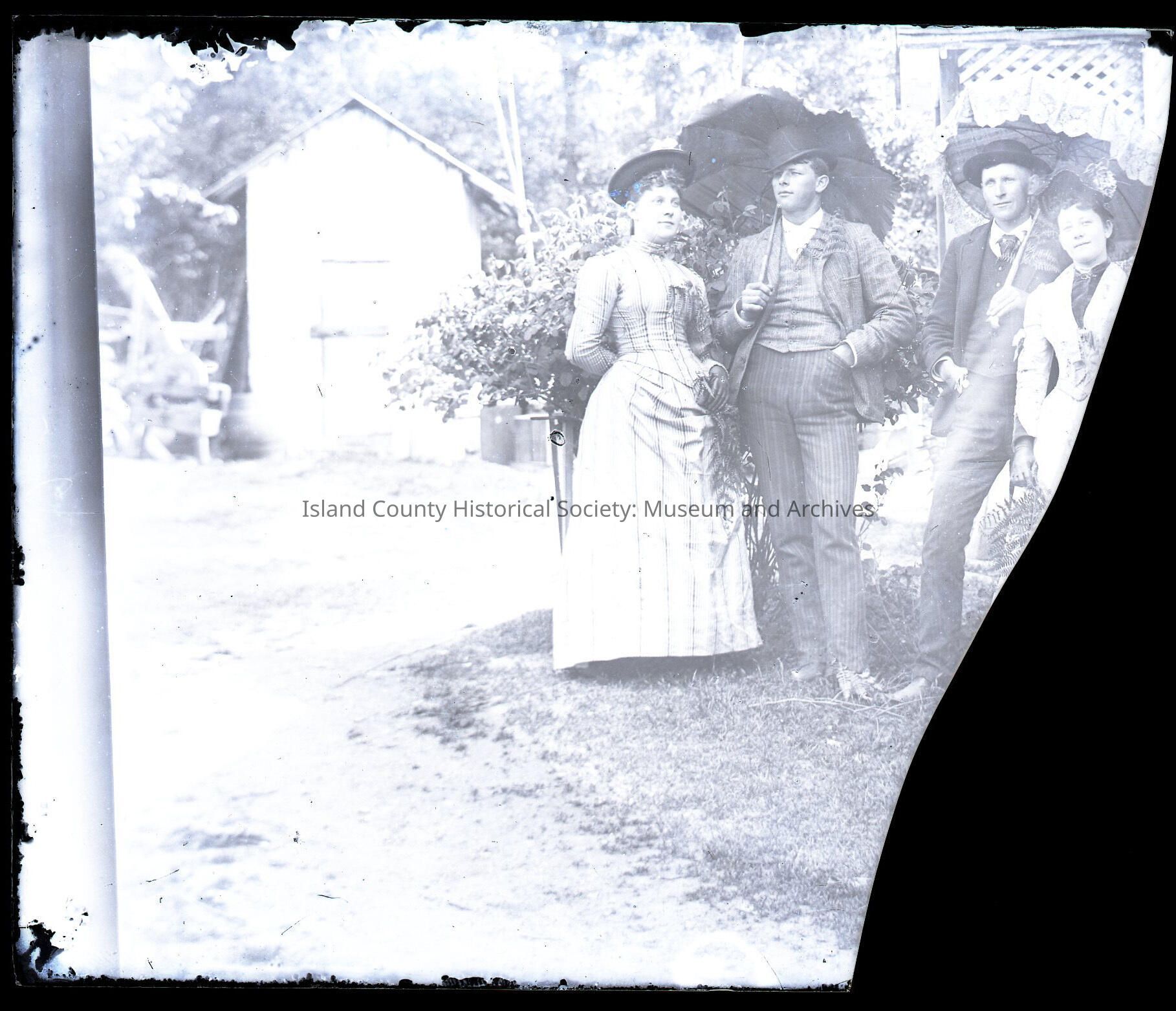 Two couples all dressed up standing in probably a side or back yard. The men are holding parasols for the women. A shed is behind them.Made/Created