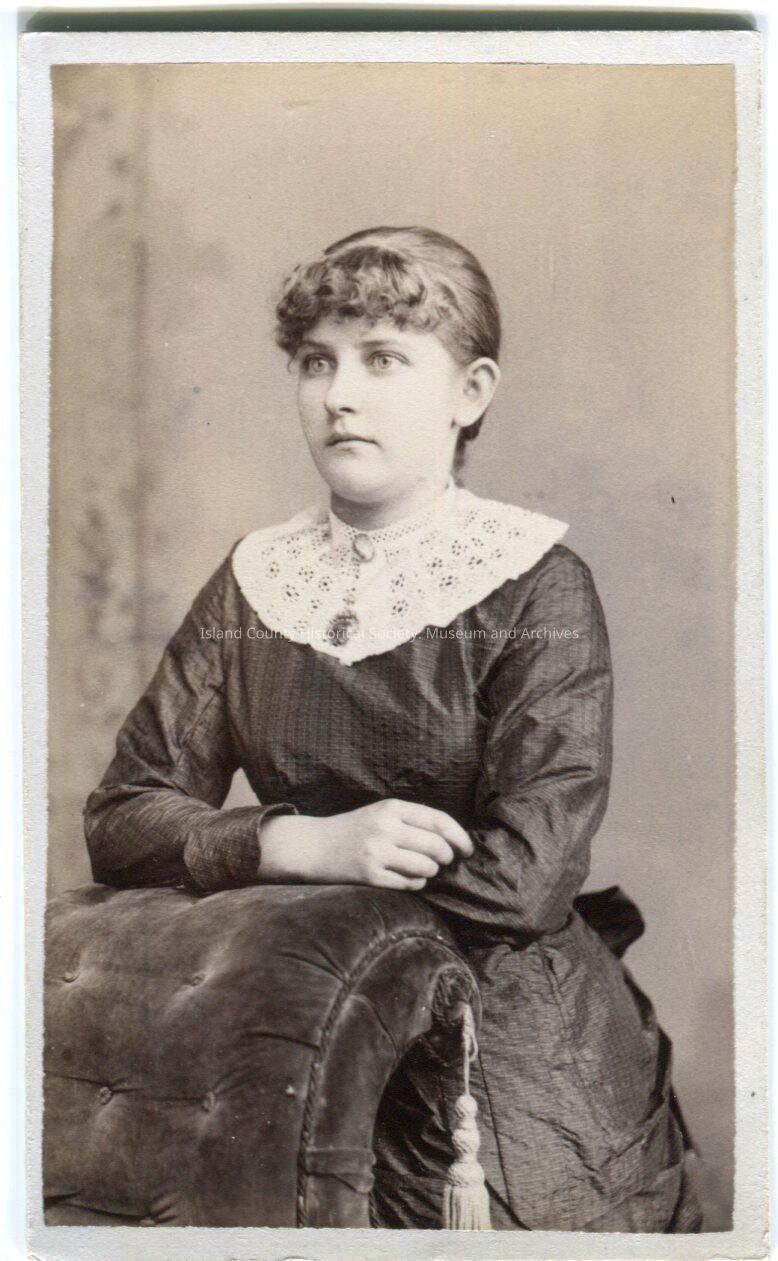 Photo of a woman looking towards her right and leaning on the back of a padded chair. She is wearing a dress with cuffed sleeves, a bow at the back, wide lace collar and pendant necklace. Her hair is curled in front and pulled back.
