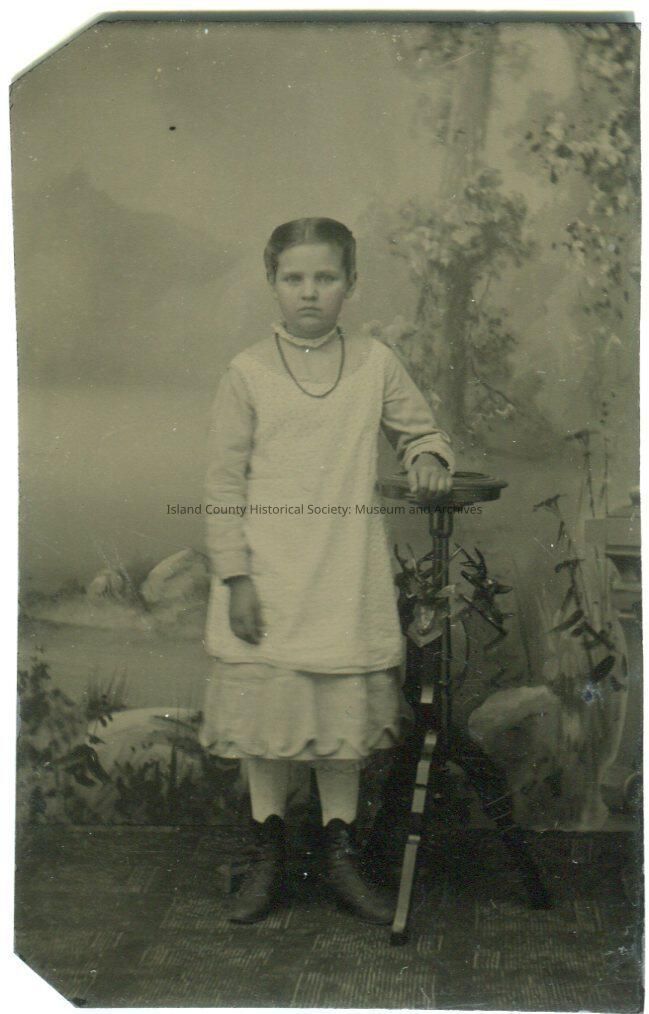 Tintype of a young girl wearing a dress and pinafore with a necklace. She has on stockings and high-top shoes. Her left arm is on a small-topped tall table. Studio portrait. These photos are from Album #19 from the Newberry home. A sticky note on the back provides a number and sometimes names. This is 9C