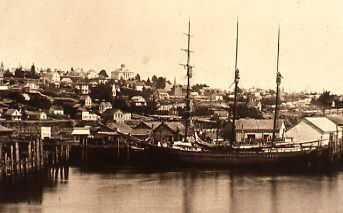 Photograph of a docked sailing ship, possibly the "Anges Muir". Likely c. mid-late 1800s.