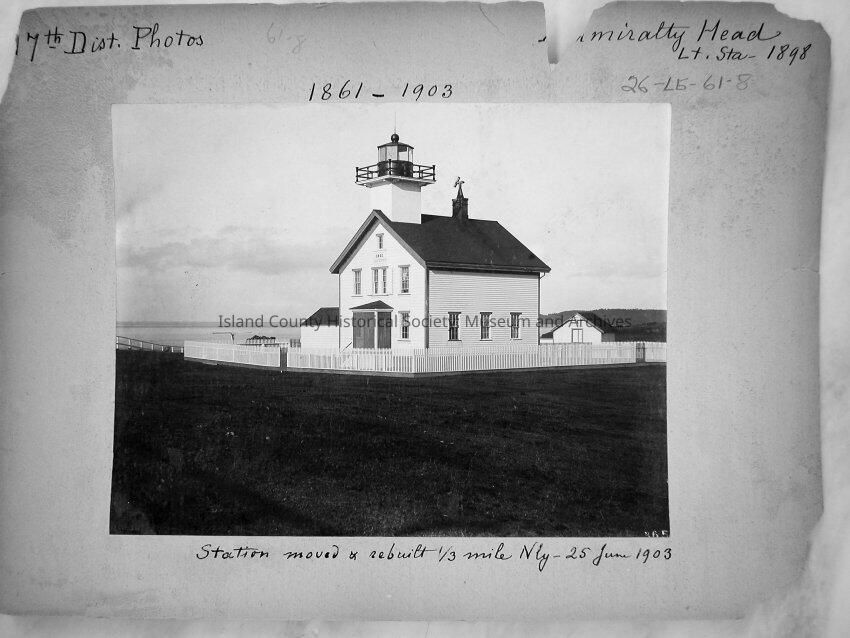 Black and white photo of admiralty head lighthouse, this is the original lighthouse. Photo is taken on a three quarter view, the front and side of the lighthouse are visible. Beyond the lighthouse the water can be seen. Top L of photo reads: 17th Dist Photos, Top R reads: Admiralty Head Light Station 1898, Bottom of photo reads: Station moved and rebuilt 1/3 mile N - 25 June 1903Made/Created
