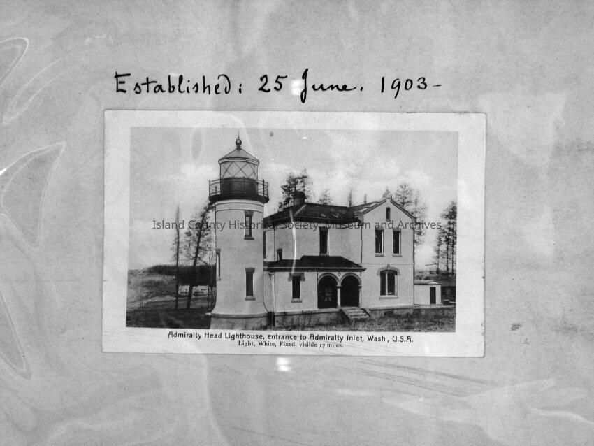 Black and white postcard of Admiralty Head Lighthouse. Top of photo reads: Established 25 June, 1903. Bottom of postcard reads: Admiralty Head Lighthouse, entrance to admiralty inlet, Wash, USA, Light, White, Fixed, visible 17 miles.
