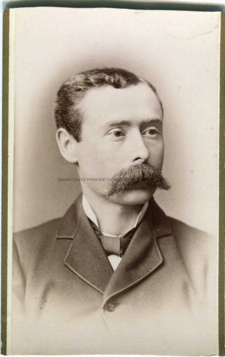 Photo of a man wearing a suit, bow tie with the ends under his lapels, wide full mustache. He is looking to his left.