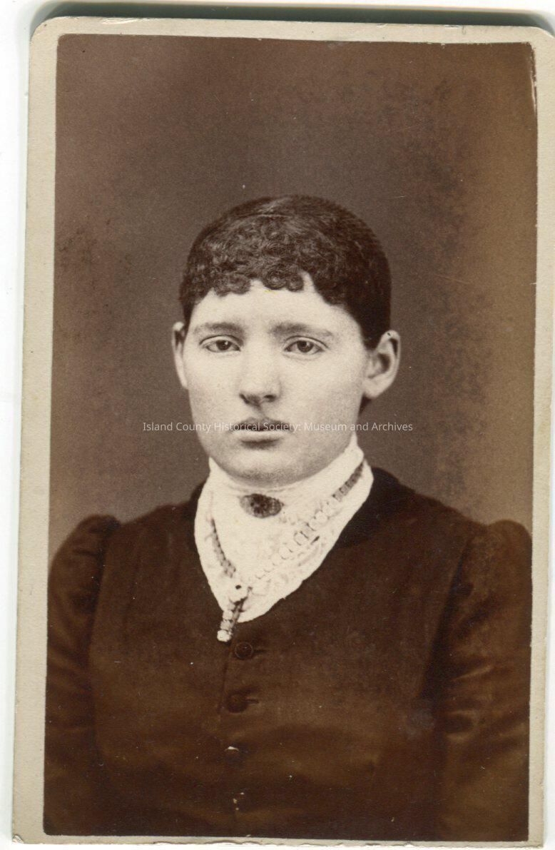 Photo of a young woman wearing a jacket with ruffled blouse, brooch and necklace. Her hair is tightly curled in the middle of her forehead and pulled back.