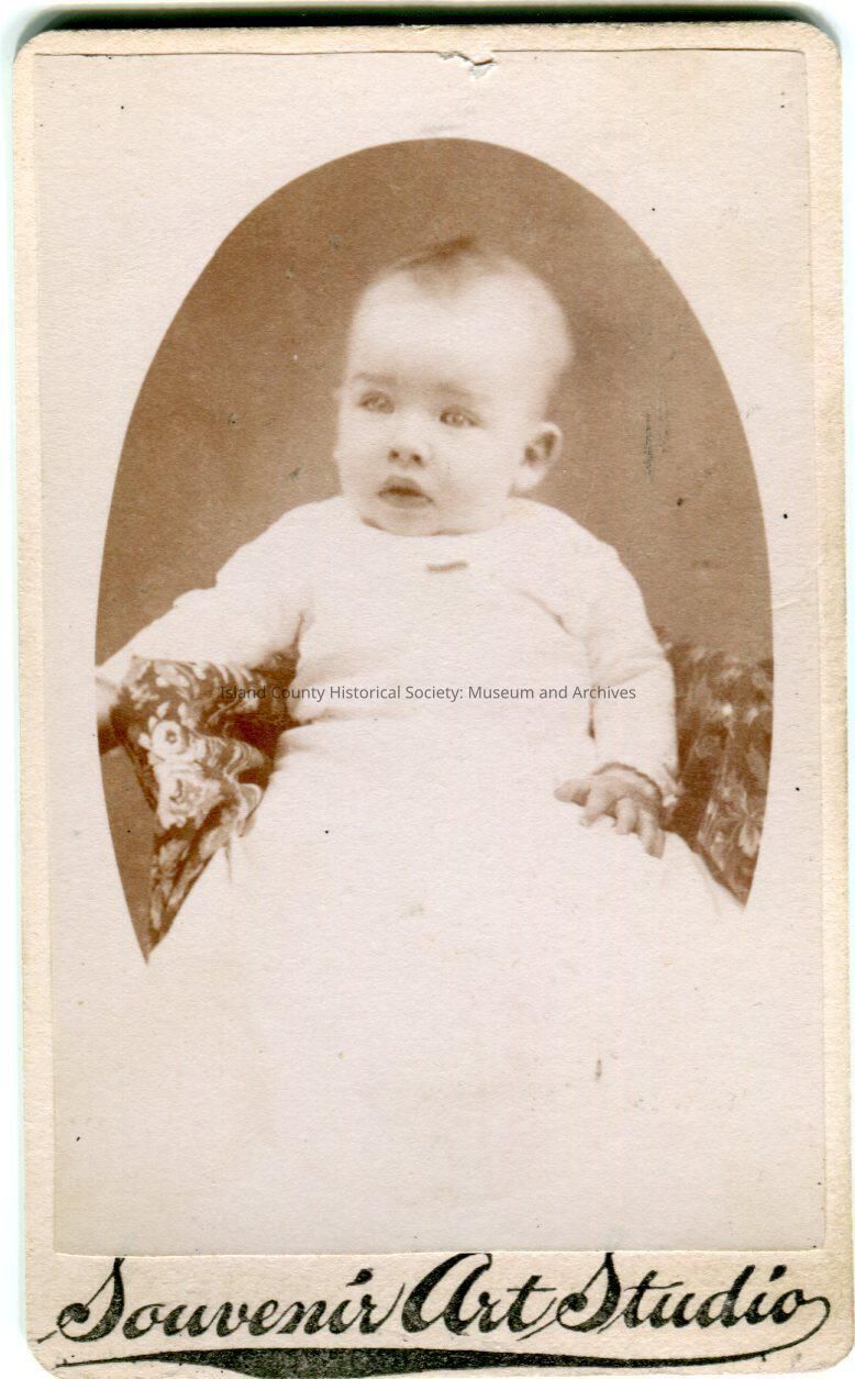 Photo of a baby wearing a long dress and sitting in a covered chair. Studio portrait. These photos are from Album #19 from the Newberry home. A sticky note on the back provides a number and sometimes names. This is 11A