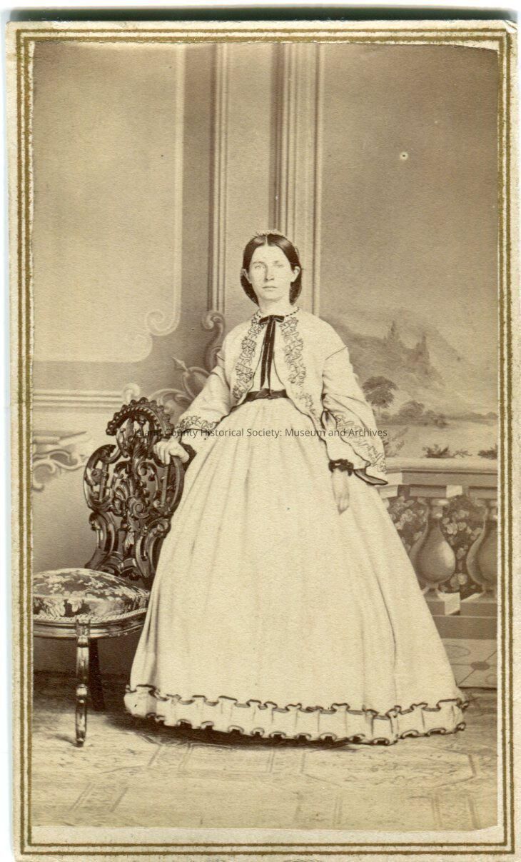 Photo of an woman standing with her right hand on a chair. She is wearing a dress with draped jackeet. The skirt is wide and full with a ruffle on the bottom. The jacket has wide sleeves and frogging in the front center halves and on the sleeve ends. She has a bow with long ties at her neck and a belt or sash at her waist.