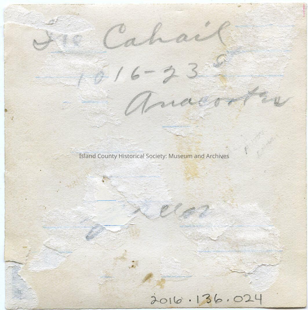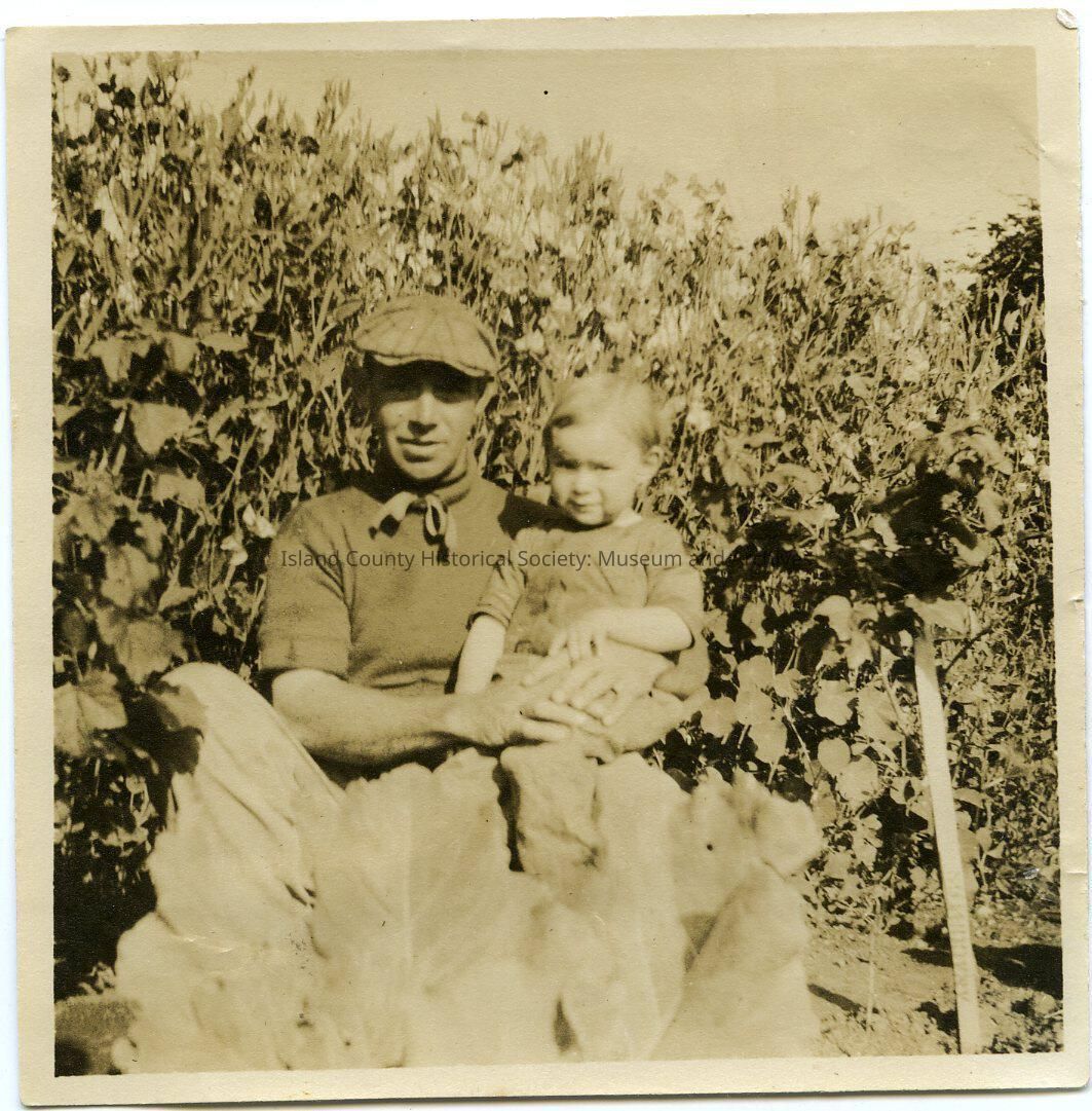 Photo of a man in a flat cap and kerchief around his neck holding a young child on his left hip. He is stanidng in a field of flowering crops. On the back: "Joe Cahail 16-23 Anacortes." Earl and Allan Cahail - date likely 10.16.1923.