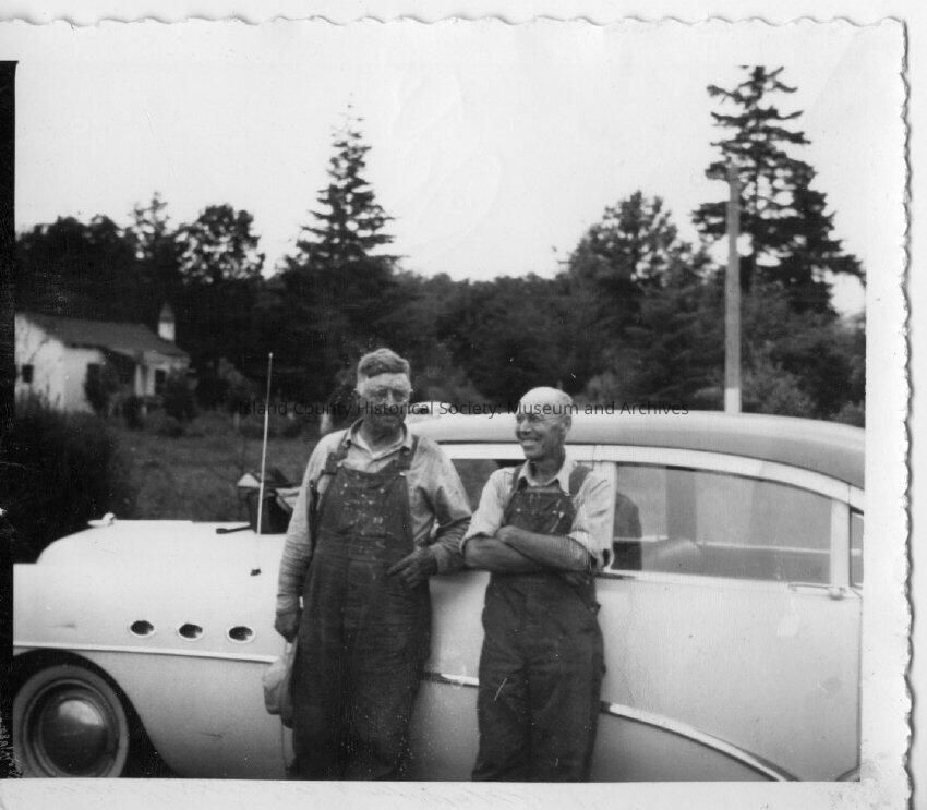 Black and white photo of two men standing in front of a car. Both men are wearing overalls. Back of photo reads: 07/06/1957 Left - John Josefson, Right- Sam Porter, Bush Pt. Rd.