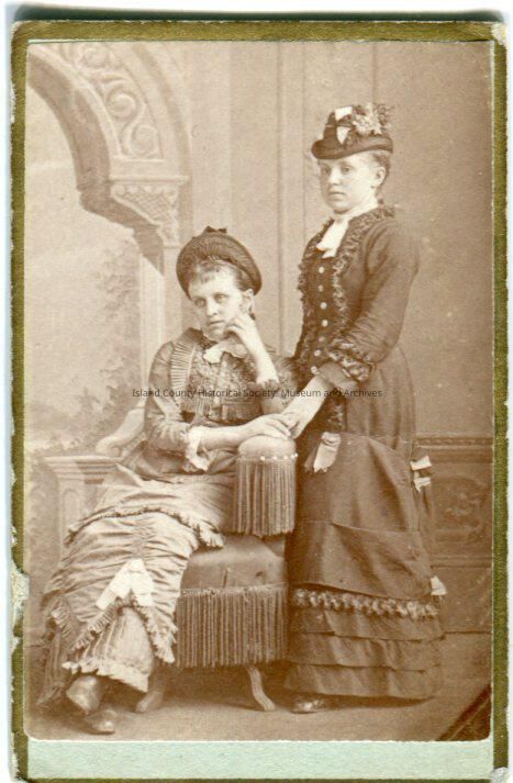 Photo of two young women, one seated in a chair with tassels on the arm/back and from the seat, the other standing on her left. The seated woman is wearing a dress with ruffles, and at the hem the dress is in an inverted with with ruffles and a bow. The standing woman is wearing a dress with ruffles, jabot, bows in varoius places, and gloves. They are both wearing hats. The left hand of the standing woman and the righ hand of the seated woman are touching.
