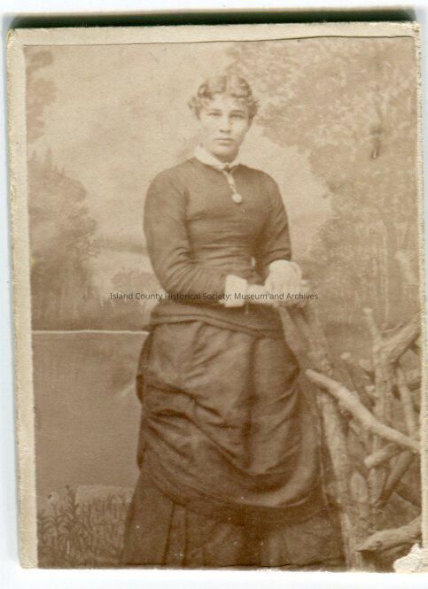 Photo of a young woman wearing a dress with lace at the collar and cuffs, a necklace and a draped overskirt. She is standing beside a chair made from branches with her crossed hands on the back. The bottom of the picture has been cut off.