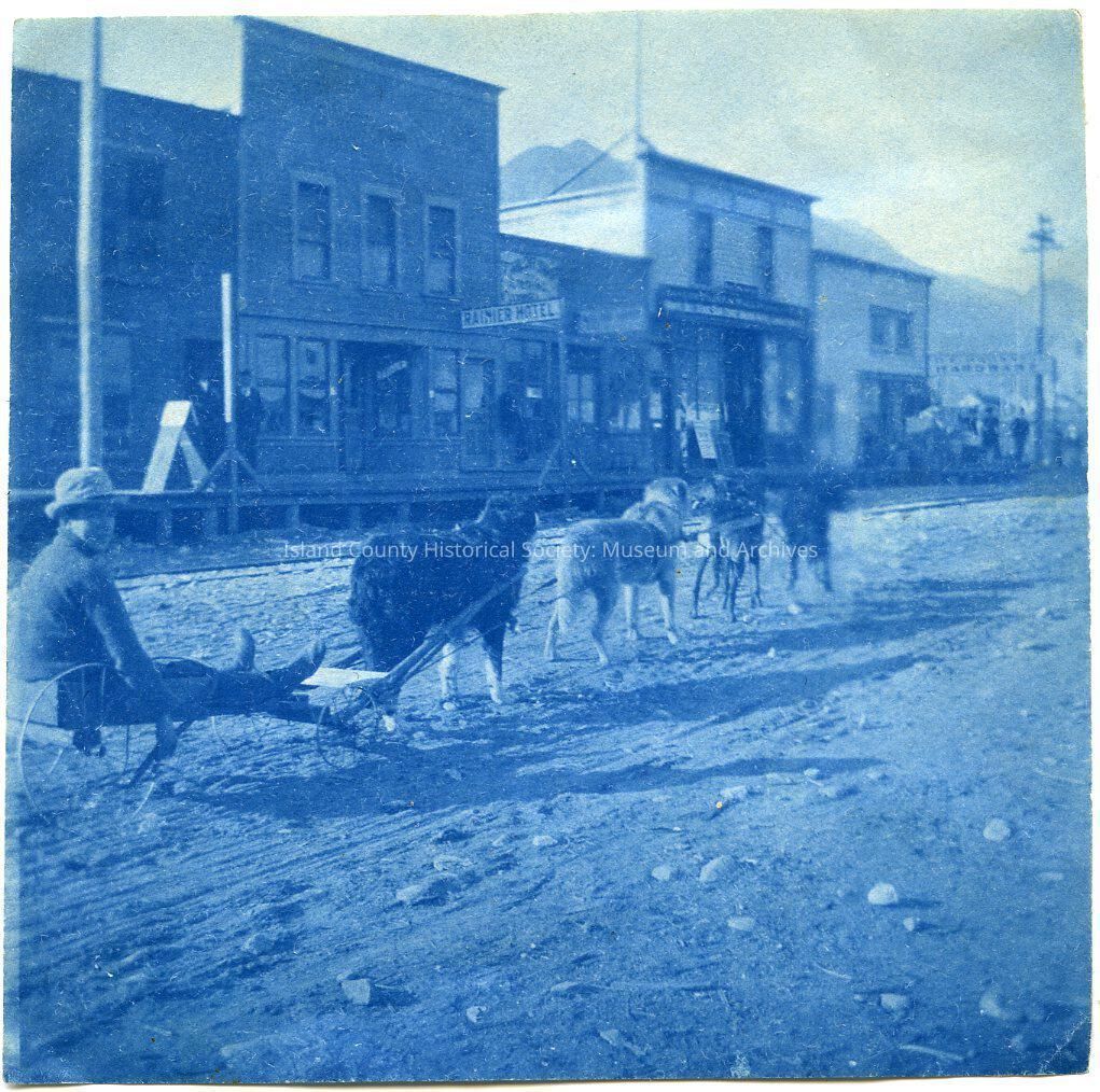 Photo of a town with stores, Ranier Hotel, wide dirt road. Wood buildings. Man on wheeled low cart being pulled by at least 4 dogs. Blue tint.