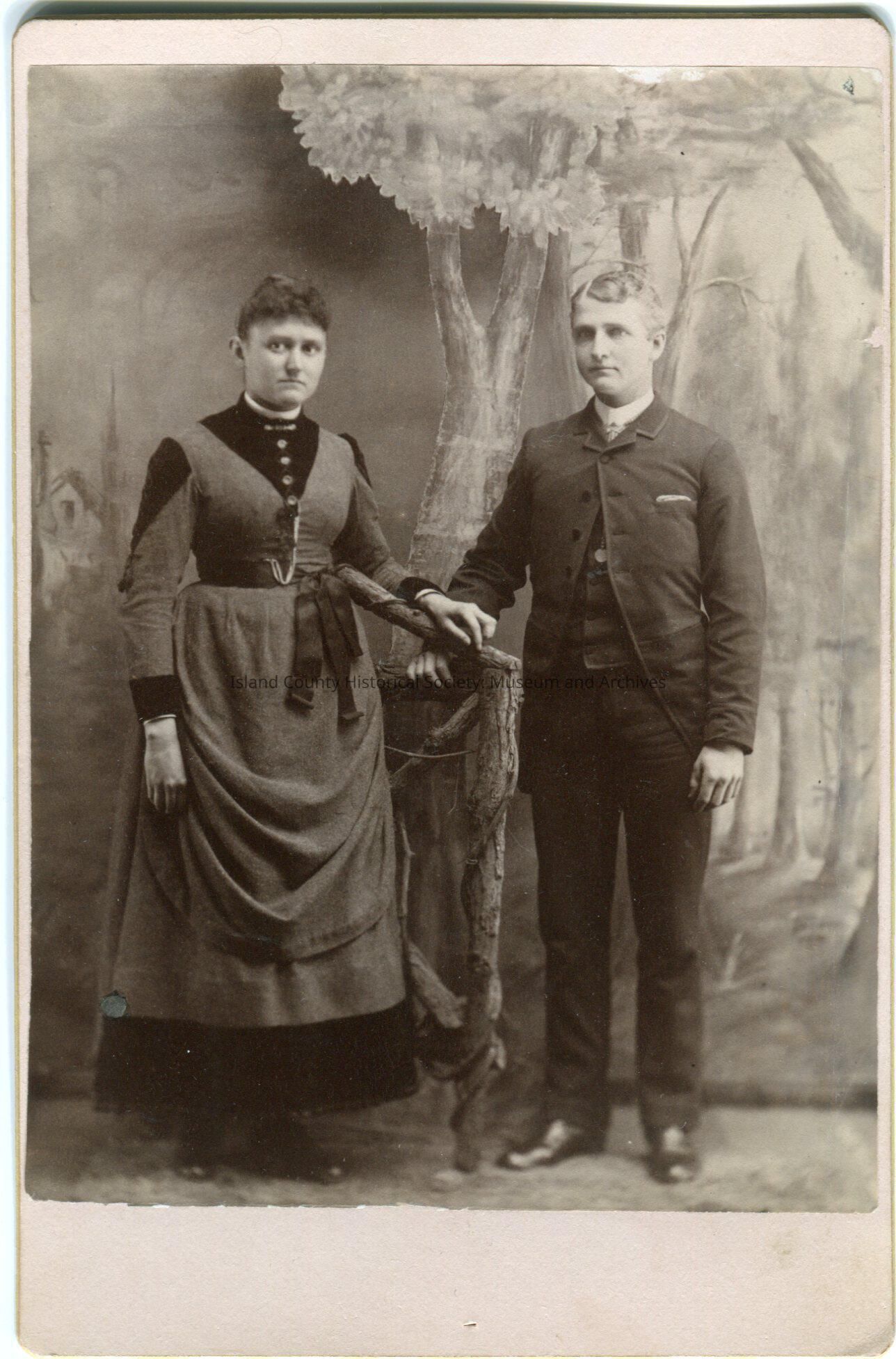 Photo of a young woman standing on the right of a young man. She is wearing a dress with contrasting material at the bodice in a v-neck design, cuffs, and patches on her shoulders. The dress has buttons on the bodice, a watch fob, draped overskirt, and darker underskirt. The man is wearing a suit with the top button buttoned, a tie and watch fob. Their hands are resting on a studio prop between them.