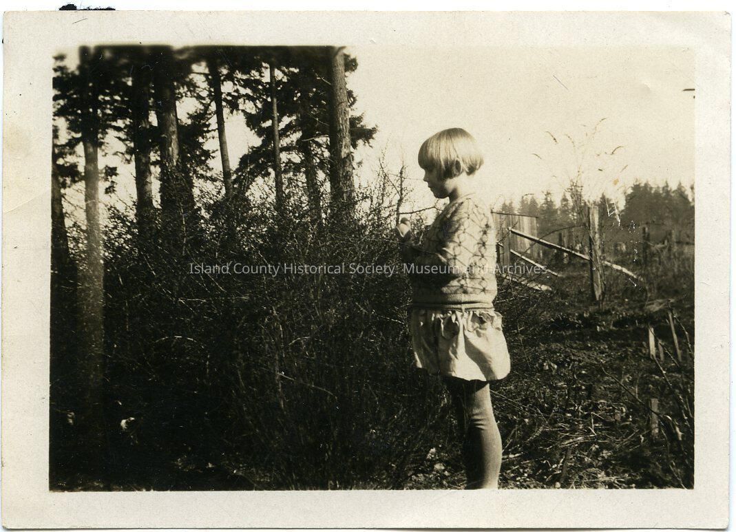 Photo of a young girl holding something facing trees and bushes, rural setting.