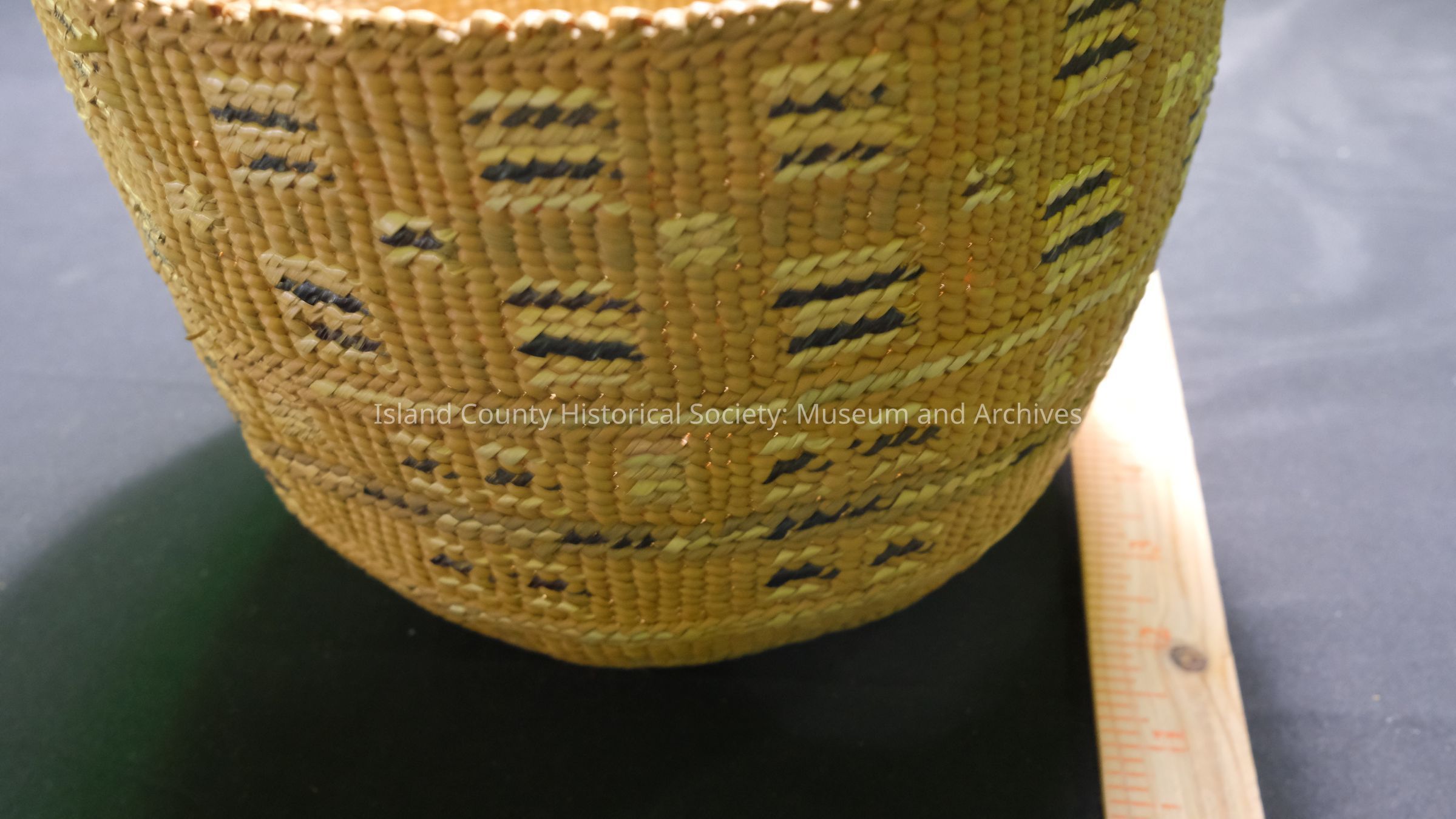 Large, light brown basket with fine lines of green, cream and black striping. Fraser River, Canada