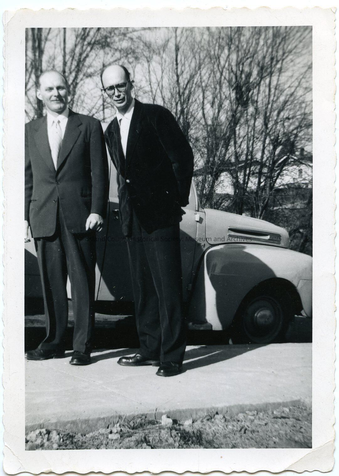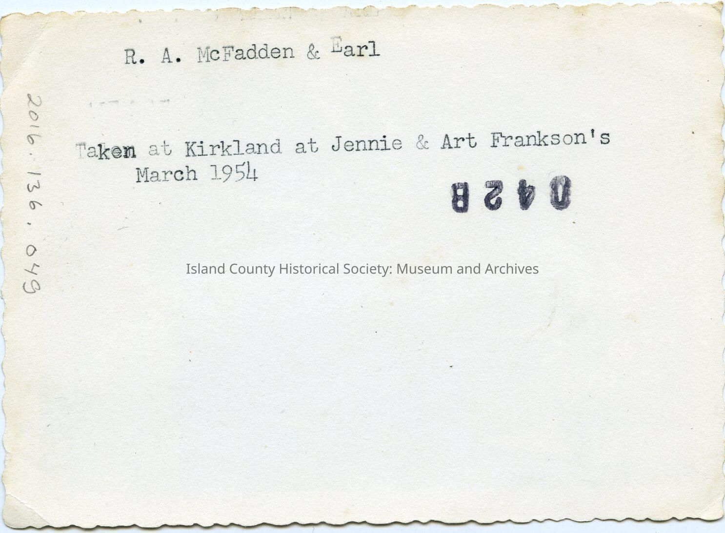 Photo of two men standing in front of a car or small pick up truck. Both wearing suits. On the back: R. A. McFadden & Earl, Taken at Kirkland at Jennie & Art Frankson's March 1954.