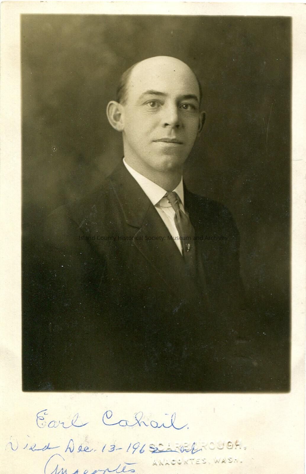 Photo of a man in suit and tie - on the bottom of hte attached card - Earl Cahail. Died Dec 13, 1962 in Anacortes. Same photo as 2016.136.026. CYKO postcard - issued: 1904-1920's.Made/Created