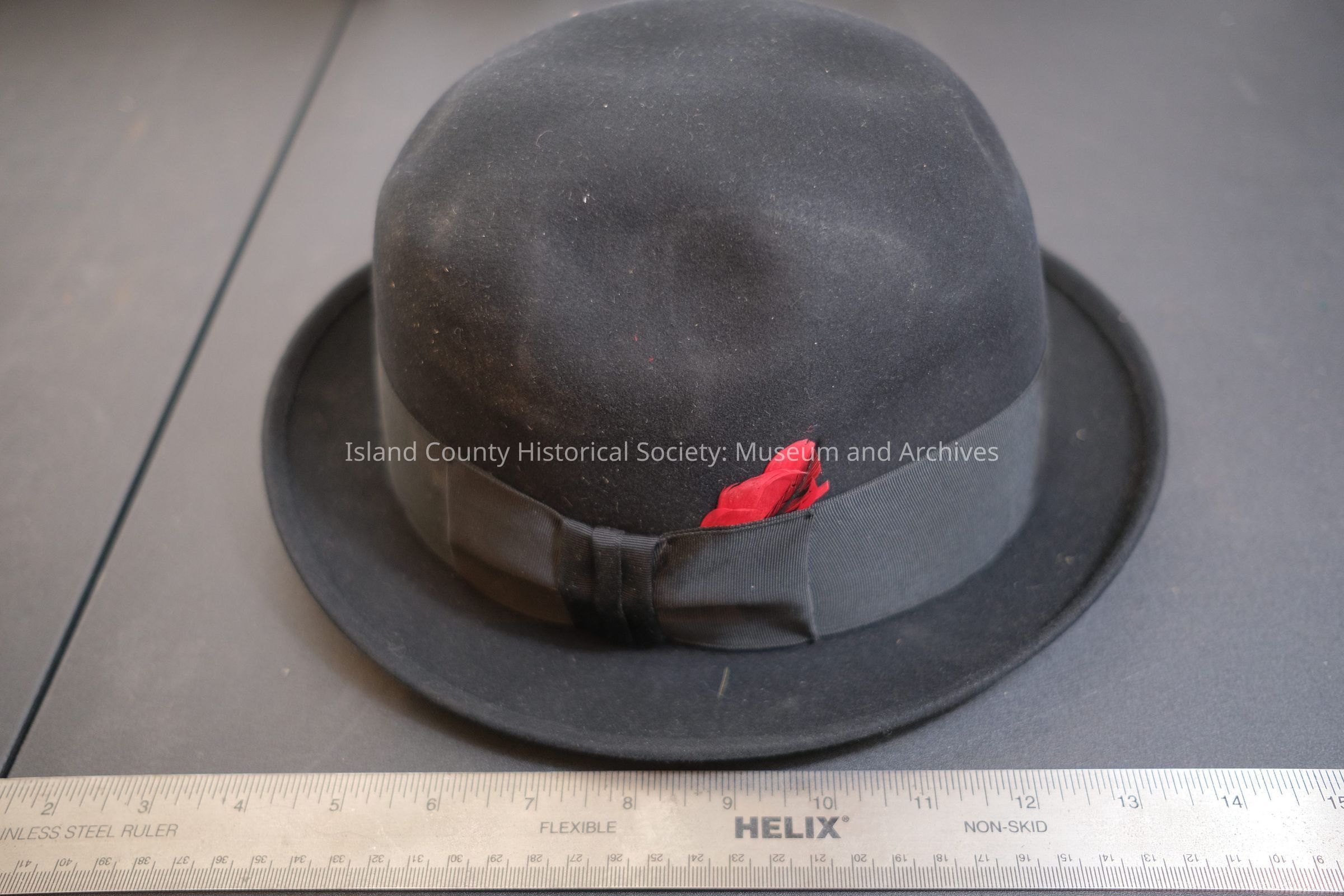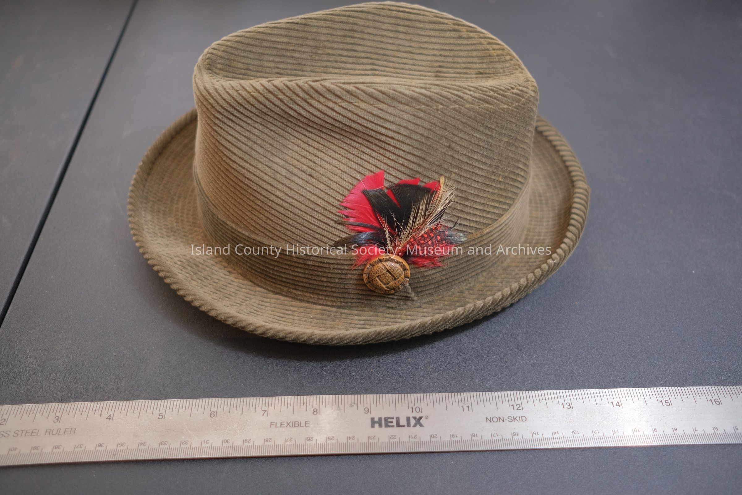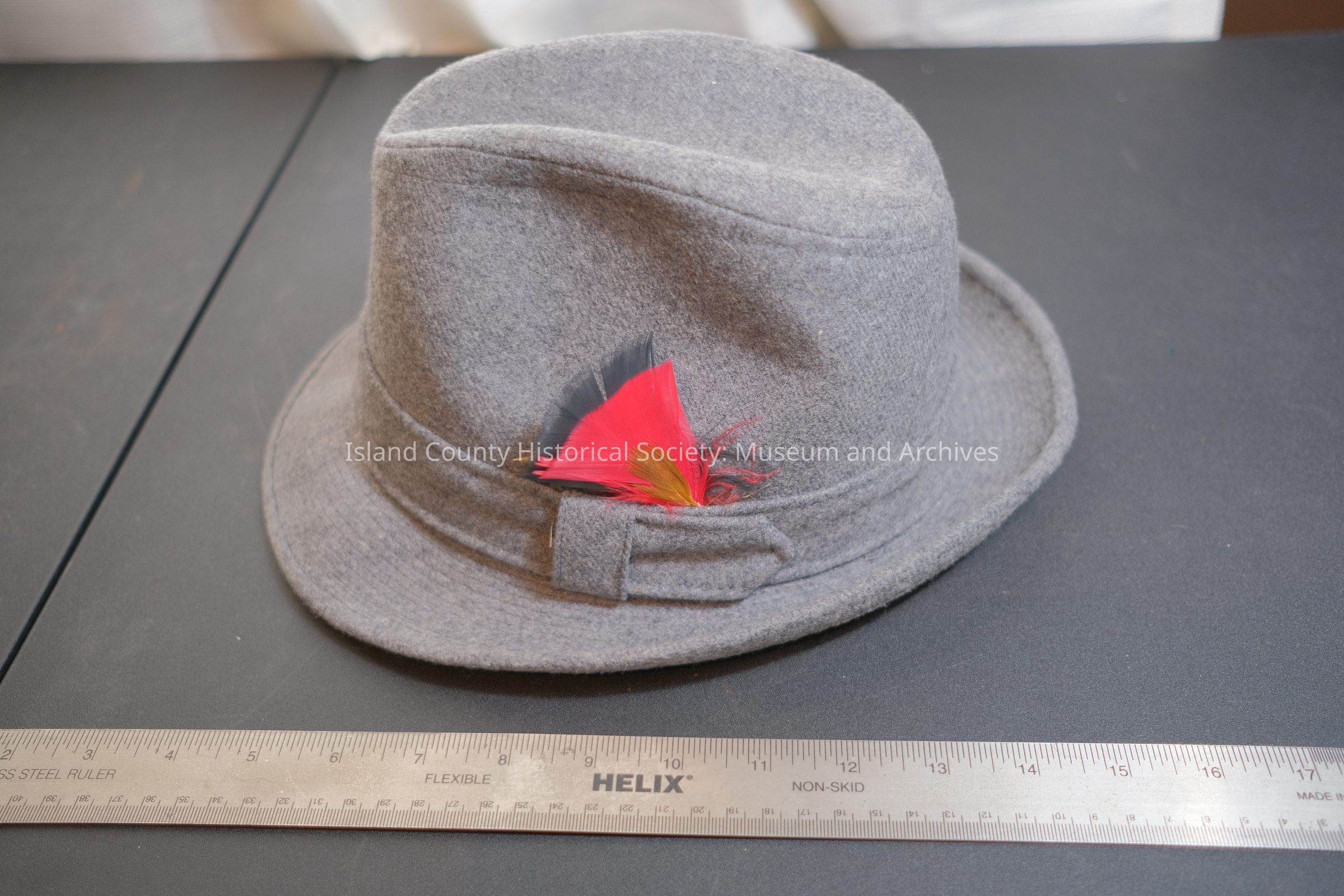 565 - man's gray flannel hat w/ flannel band and red/black/gold feathers