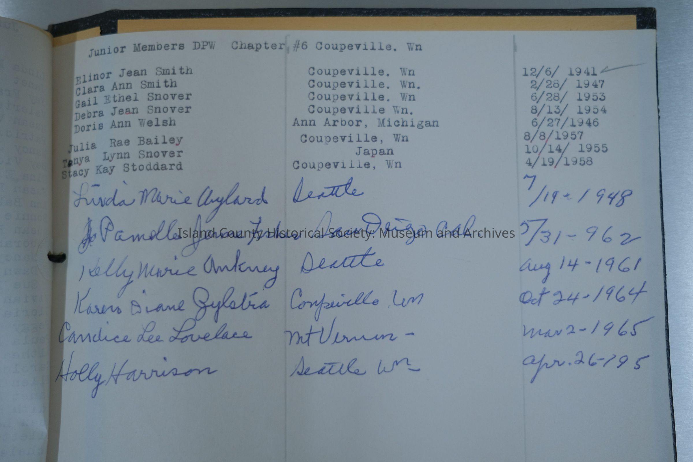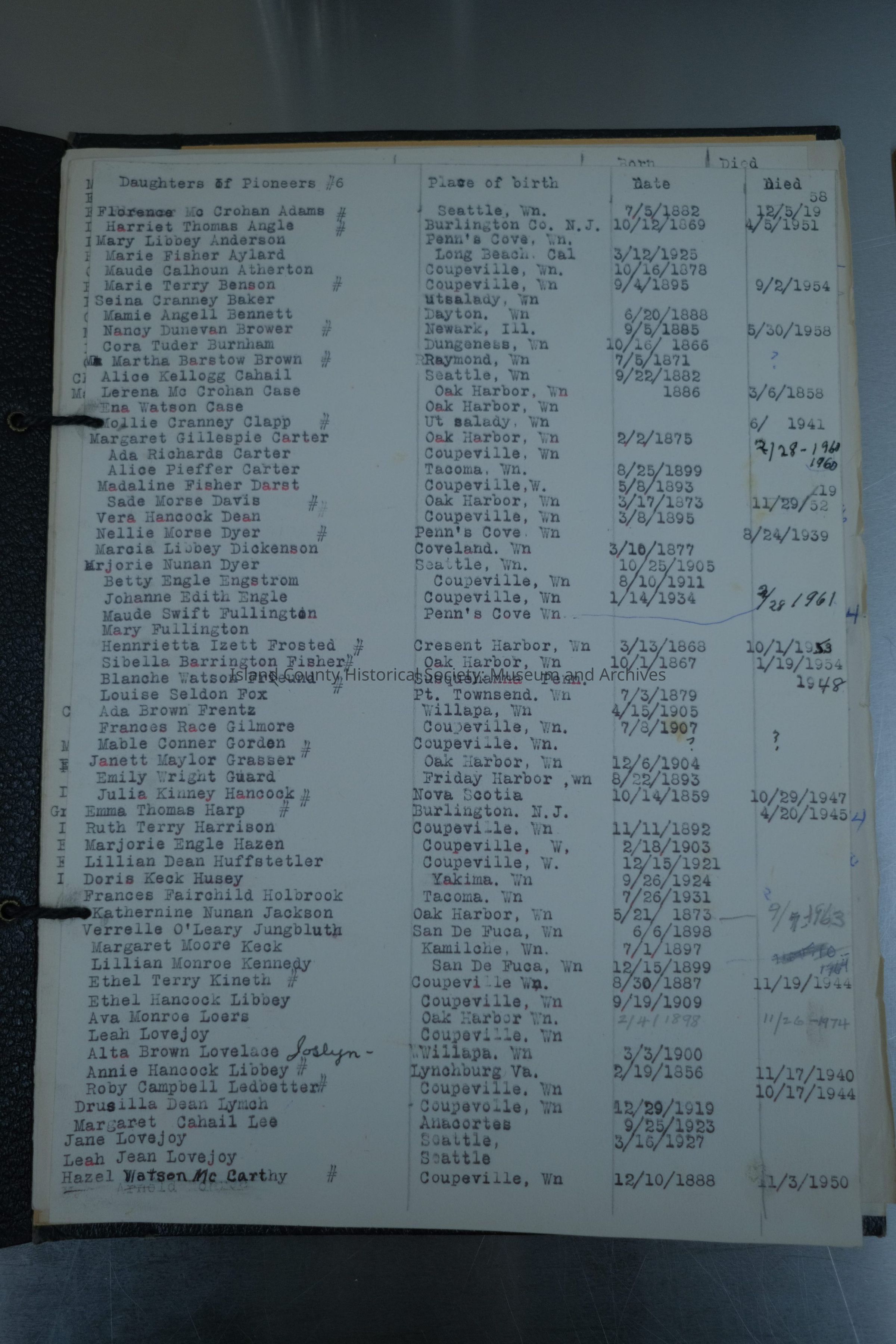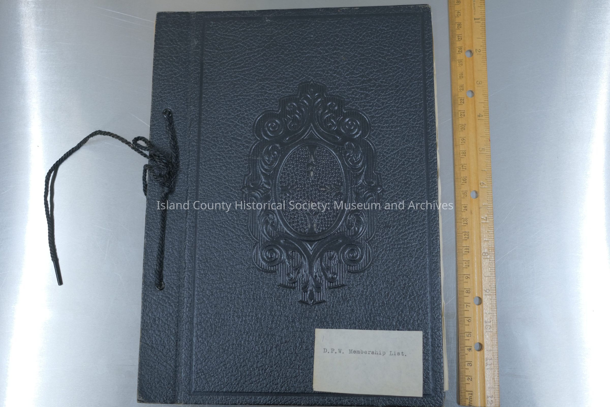 large, thin black string bound book of DOPW membership list including information on date of birth and date of death