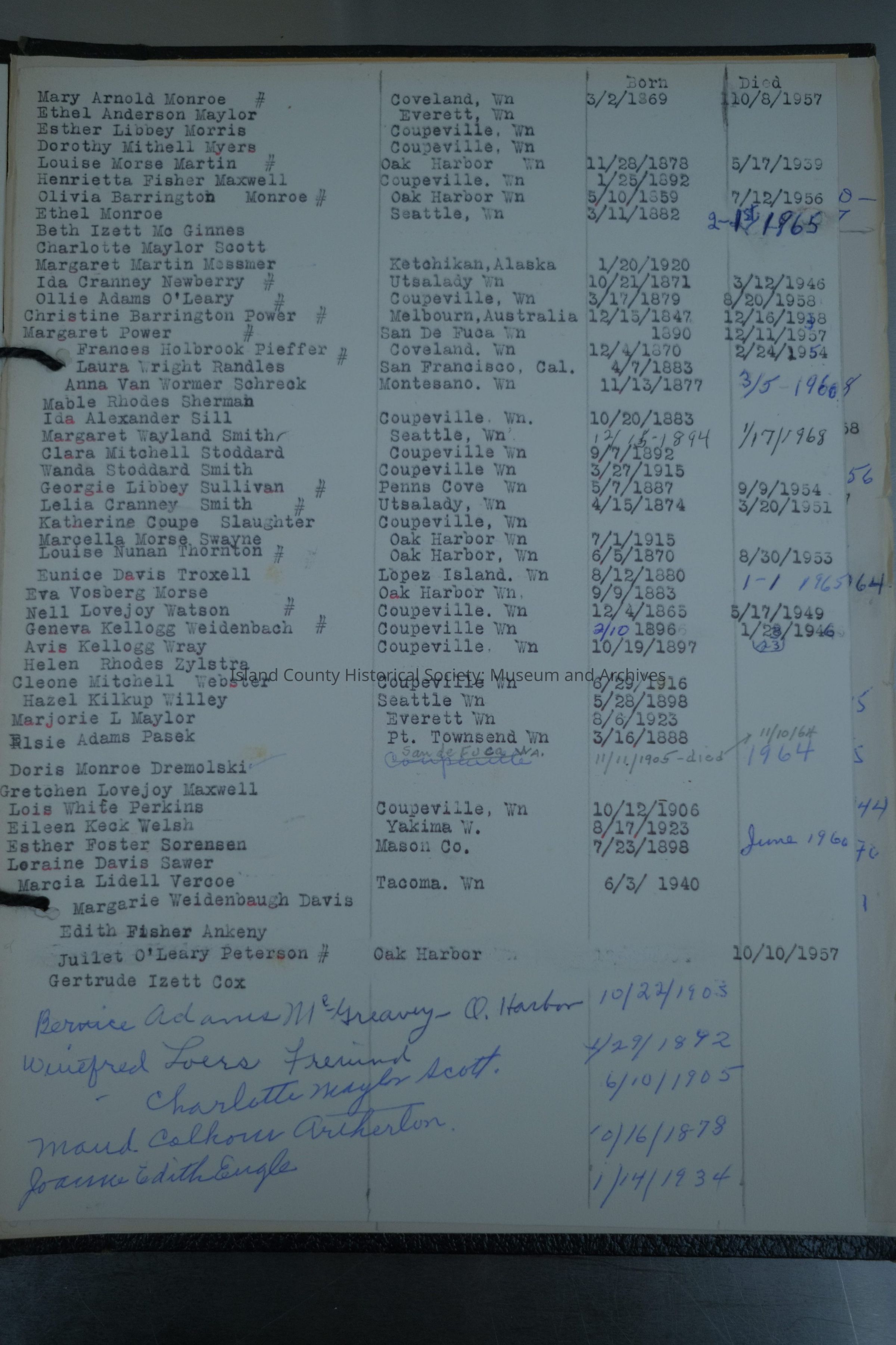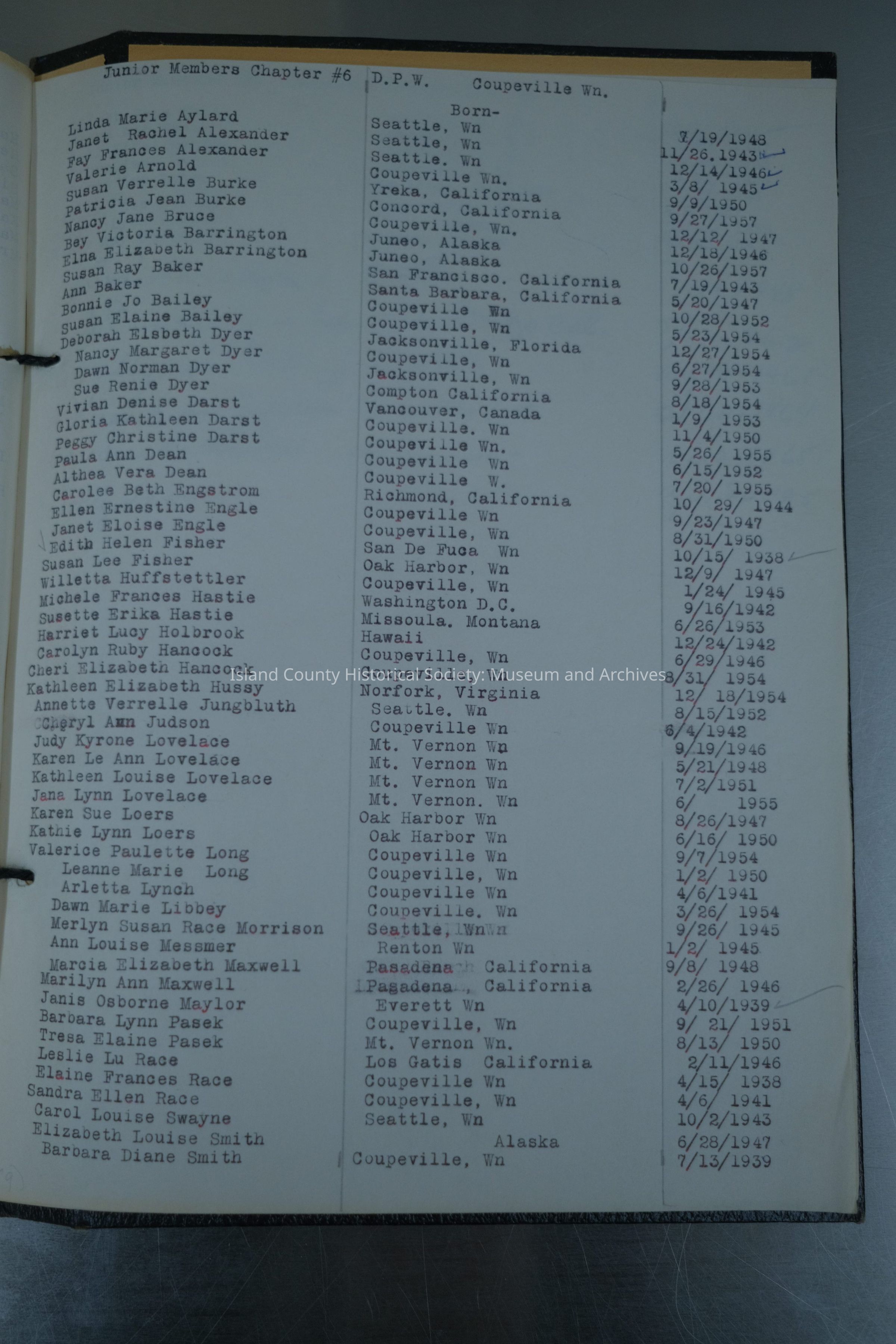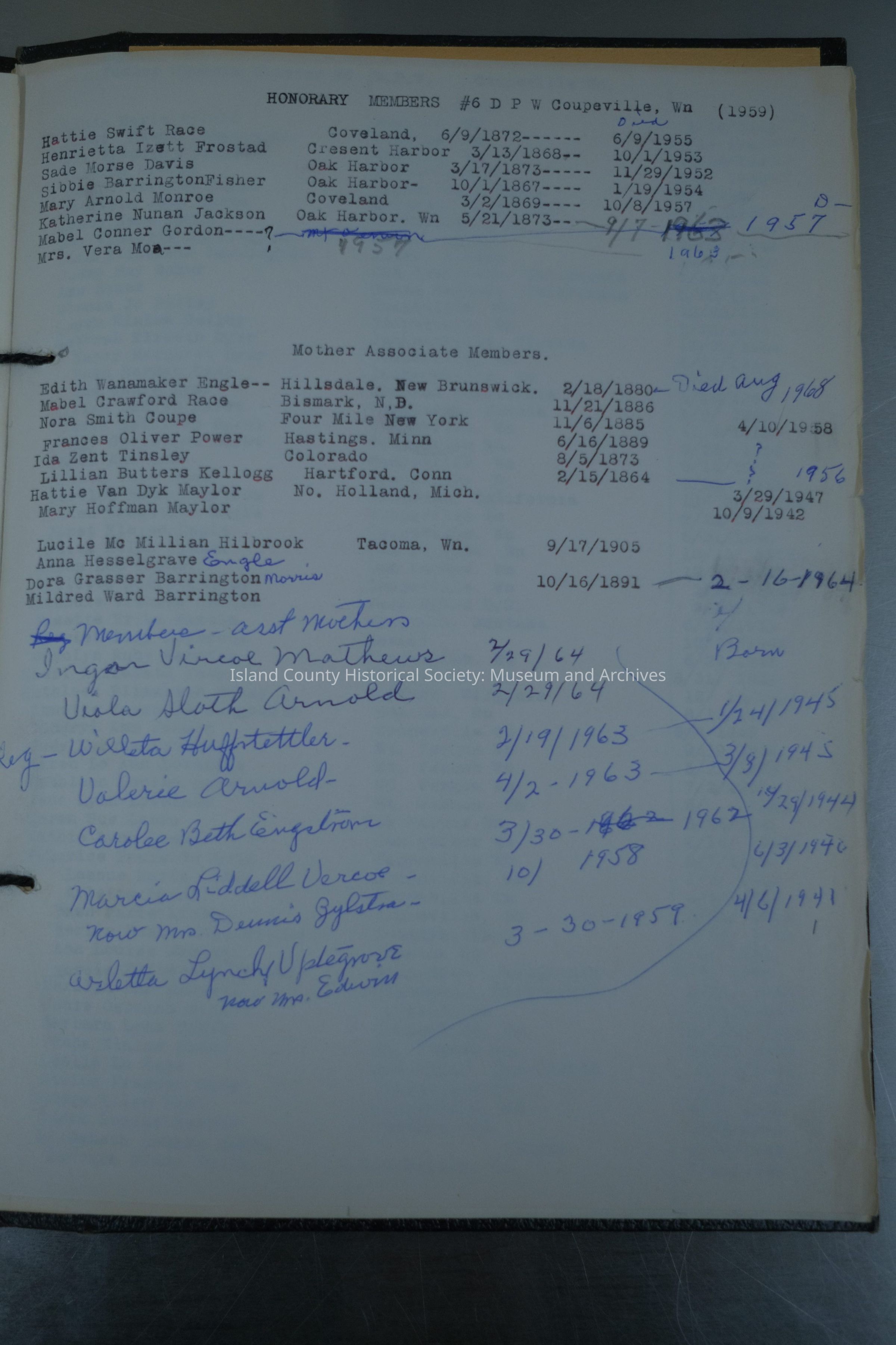 large, thin black string bound book of DOPW membership list including information on date of birth and date of death