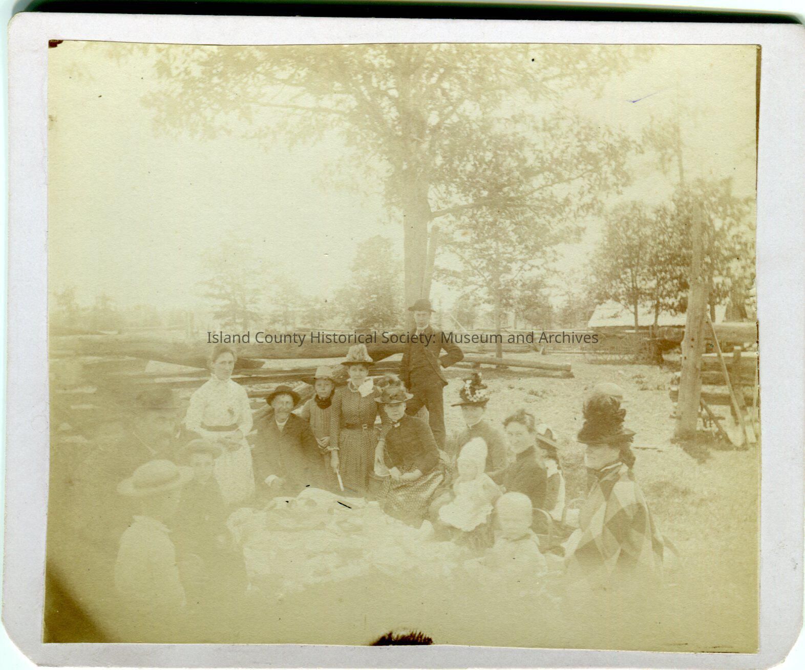 Photo of a family or group portrait taken outside. There are men, women and children of varoius ages. They are dressed in suits, dresses, and hats, There are at least two picnic baskeets. In the center is a patchwork quilt. There are trees, fences, a building on the right in the background and a carriage.