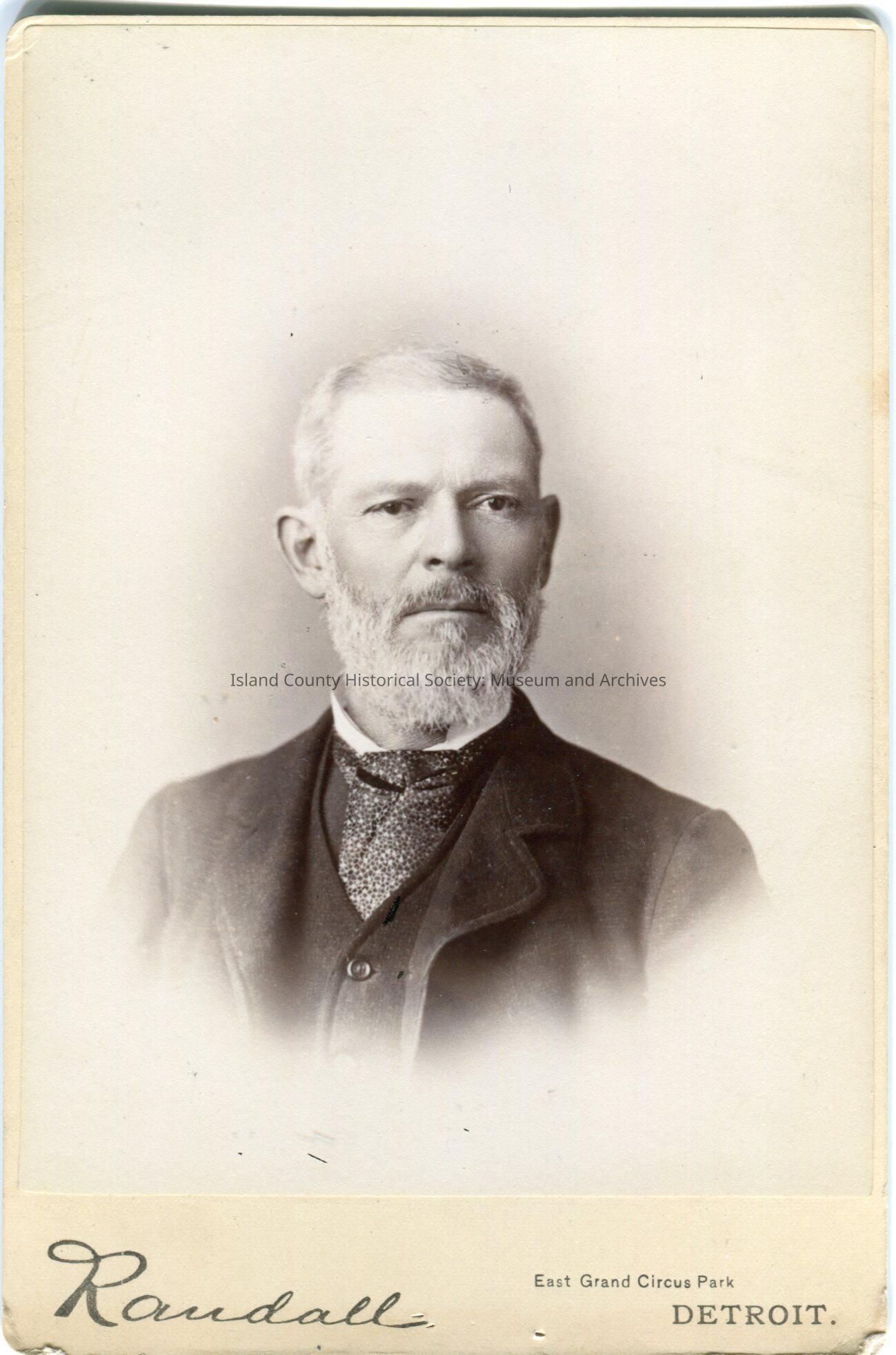 Photo of a man wearing a suit, speckled tie, and has a beard and mustache. He is looking to slightly to his left.