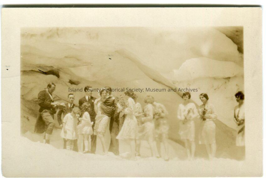 Photo of a group of men, women and children, standing amid a rock formation. It looks like a wedding party. Women are carrying flowers, one of the men (groom?) has a buttoniere. One of the women (bride?) has a wreath or headpiece on. The man on the far left is holding a boodk. The women's dresses are knee-length. It is a bit breezy.