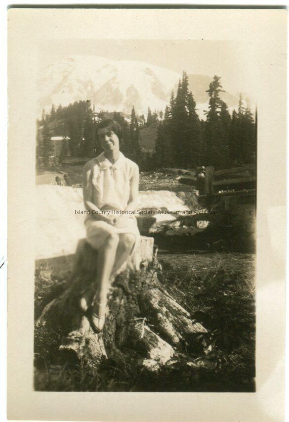Photo of a young woman seated on a tree stump with a snowy mountain in the background. She is wearing a knee-length sleeveless dress with strapped shoes. These photos are from Newberry family folder.